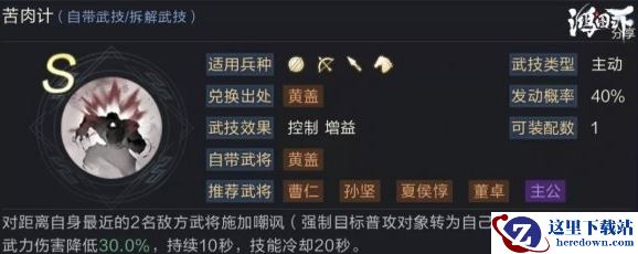 苦肉计可对携带者自身最近的两名敌方武将施加嘲讽,强制转移普攻目标,并在持续时间内为自己施加免伤。该技能对连击将比较克制,可以起到很好的保护作用。