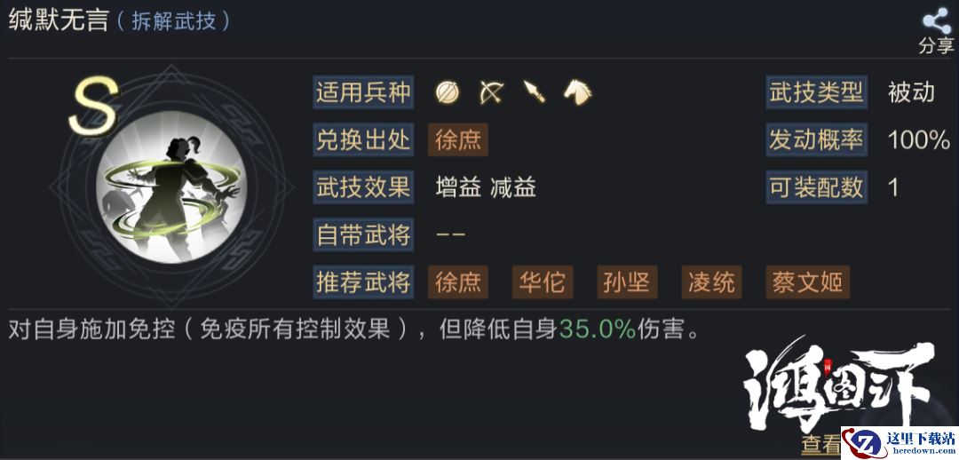 2号技能推荐缄默无言,可让华佗免疫所有控制效果,但伤害降低35%。作为依靠自带武技主动效果来为队伍提供治疗的华佗来说,免控是非常重要的,而伤害降低35%的debuff对华佗影响也不大,其本身就不需要打输出。