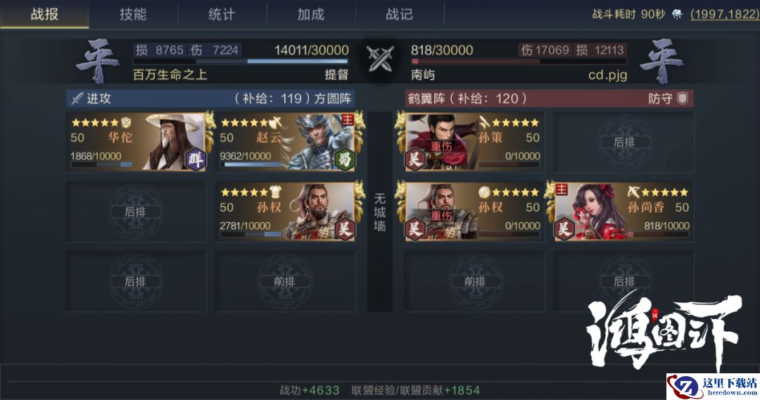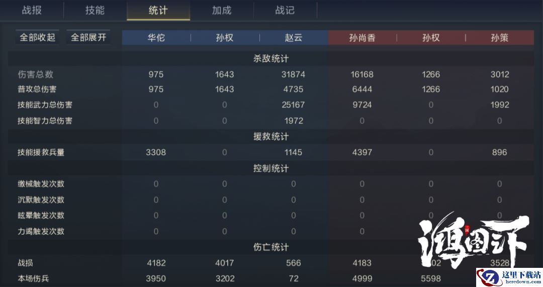 实战中,武将的站位需要根据实际情况进行调整。如对方主将在后排,且前排属于纯肉型武将,那么可以将赵云安排在侧列,让孙权去抗伤;如果敌方主将在前排,那么直接将赵云与敌方主将安排到同列即可。这里以三孙队进行强度测试,战报如下: