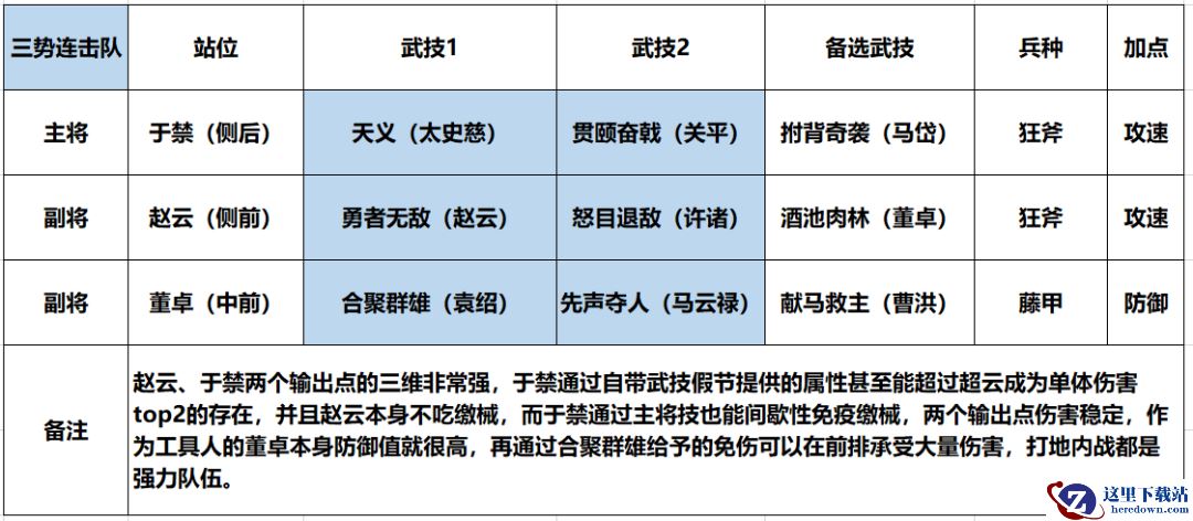 该阵容与目前非常流行的三势赵云队非常相似。不同的是,此阵容采取了摒弃治疗专注于暴力输出的连击队搭配方式,通过置换华佗和孙权提高了队伍的整体输出能力。在面对后排主将时战损会稍高一些,但面对前排主将此阵容战斗效率非常恐怖,是很强的硬拼队伍,内战和打地实力都不容小觑。