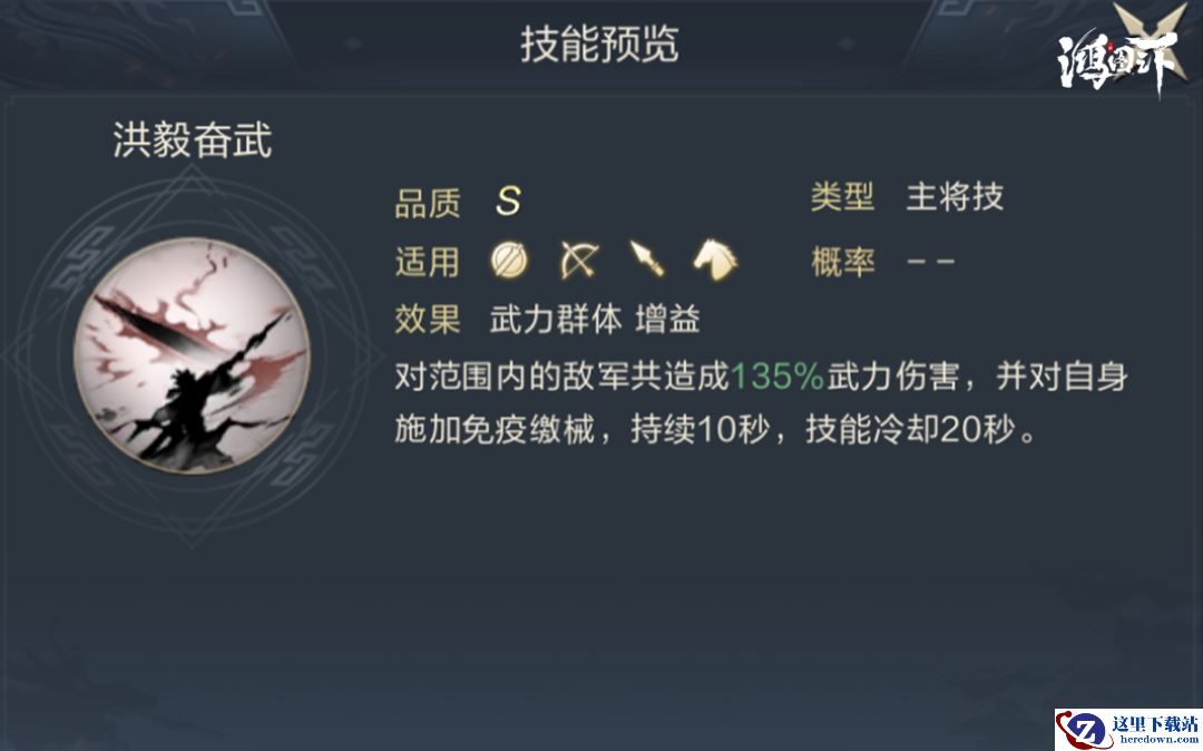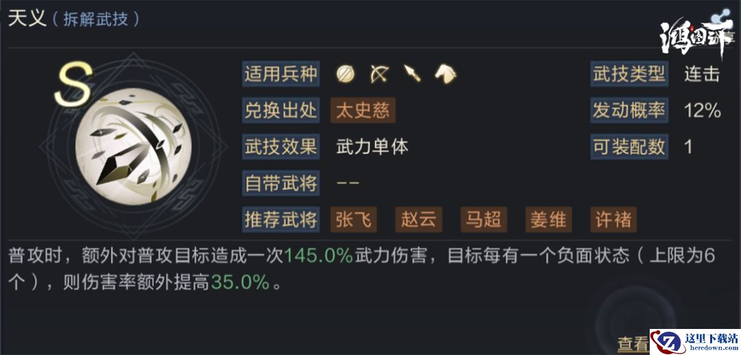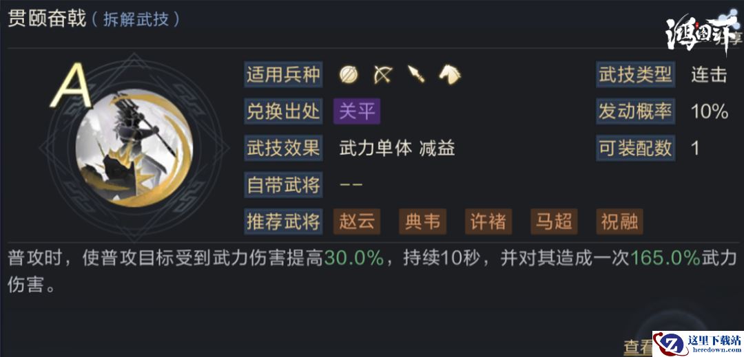 2号武技推荐贯颐奋戟,单体伤害率不算高,但可让普攻目标受到的武力伤害增加30%(以下简称易伤),是让赵云和于禁能快速击杀前排目标重要技能,同时也可提升天义的伤害量。