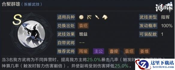 1号武技推荐合聚群雄,为于禁提供的暴击加成和为副将提供的减伤效果非常重要,也是赵云能够在没有奶妈和保护时站住前排的关键,是队伍的核心技能。