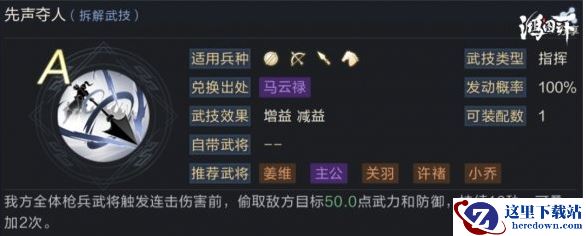 2号武技推荐先声夺人,可在枪兵角色(于禁、赵云)触发连击前偷取目标50点防御和武力,可叠加2次,是队伍中第三个关键buff,可提升输出、防御,效果非常显著。