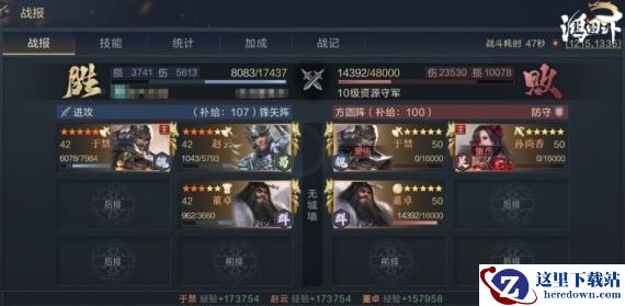 以最近比较流行的合聚赵云队作为对比,可以看出该队伍针对单一武将的能力特别强力,即使合聚赵云队有着华佗的强力治疗和孙权的减伤效果,也很快被本队击破,从技能统计中可以看出于禁通过贯颐奋戟打的伤害最多,击弱增伤明显可行。