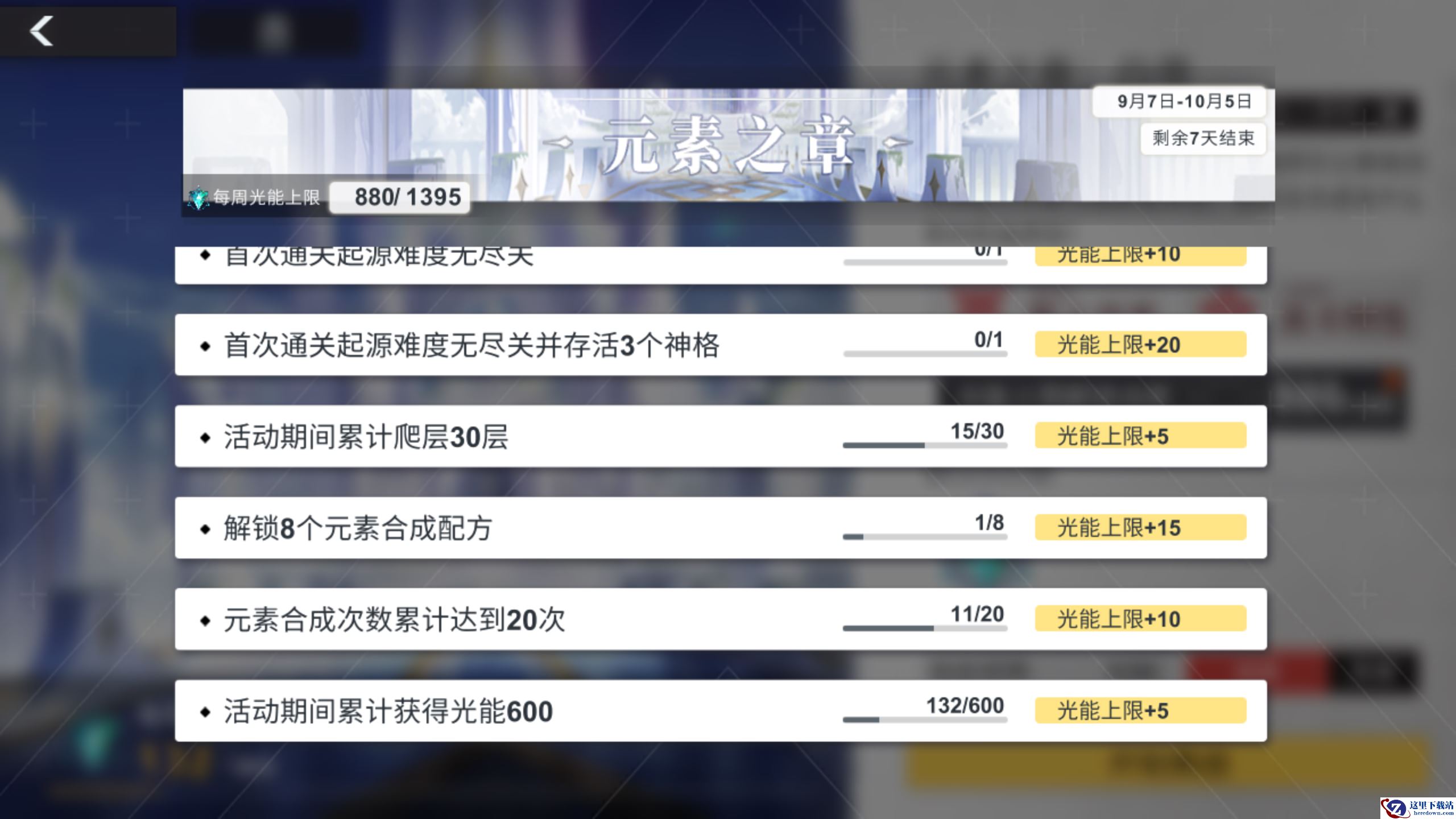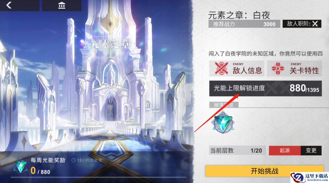 进入乌洛波洛斯关卡界面可以查看本周的光能奖励上限。光能奖励上限可以通过完成关卡任务进行提升,点击“光能上限解锁进度”,可以查看待完成的关卡任务。