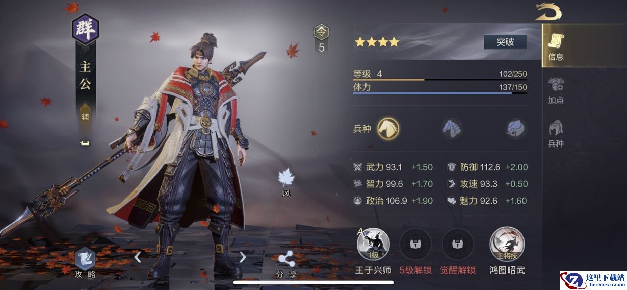 通过新手教程后,我发现游戏中不是只有三国英雄这么简单,还有主公也能征战,也就是我自己也是可以进行培养和上场战斗的,这就有了一种参与感,因为相对于别的游戏只能操控三国武将,而主公永远是那个坐在城池内提升官职,却不出战的那个,如果我的主公也是这样,那我早就另择明主了吧。