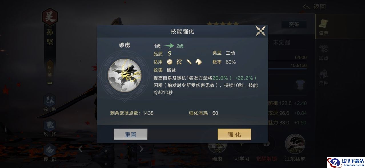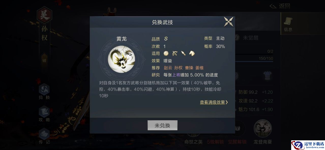 虽然三孙的闪避队基本就是靠孙坚的自带武技撑起来的,但孙权的兑换武技“黄龙”却是不得不提,可以说这个武技给孙坚将会让闪避队更上一层楼,不说逆天改命的40%闪避获得有多夸张,就算是其他属性也都非常不错,除了神算,这个是下下签。