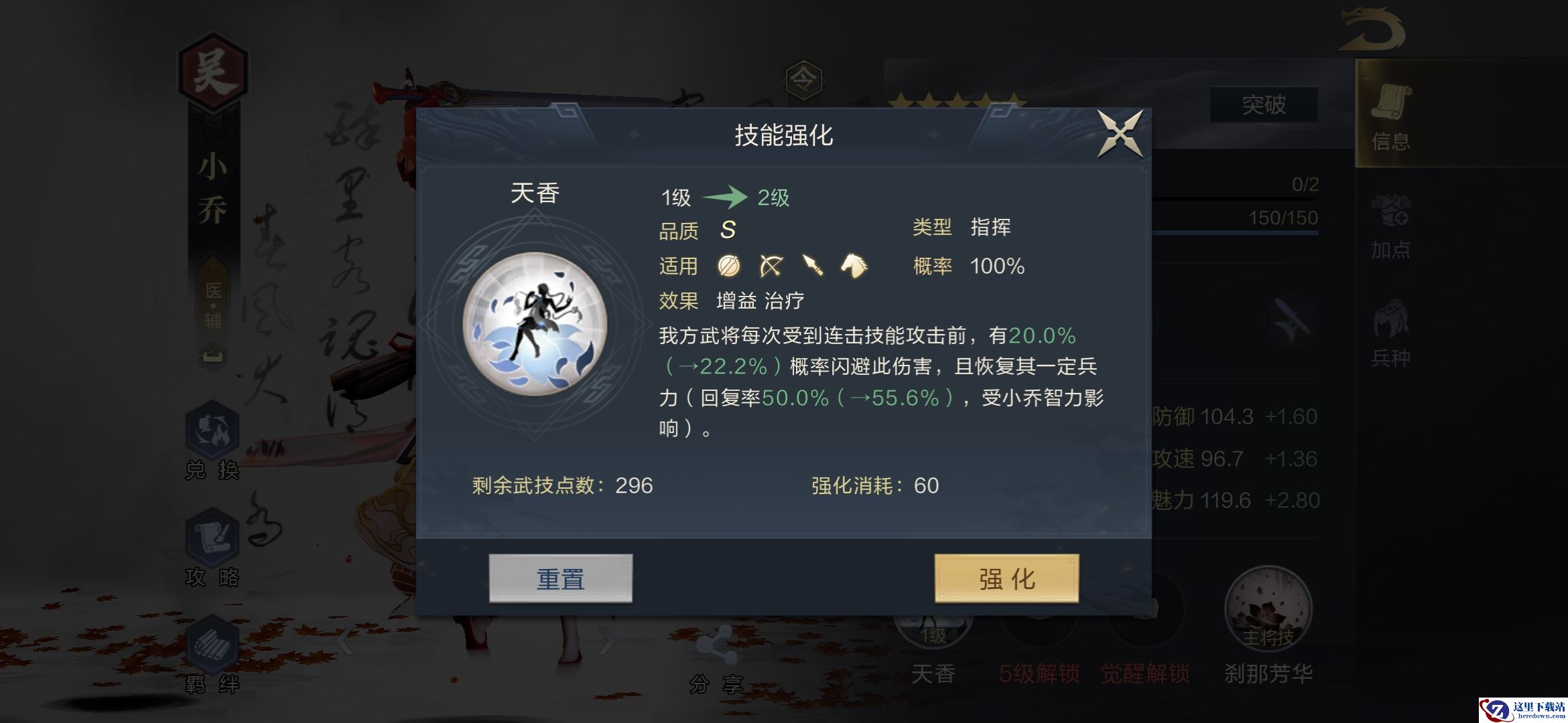 但小乔在前期的乏力并不只是其均衡的属性,其武技也是非常关键的。天香并非不强,就效果而言,面对菜刀队的连击可以概率闪避甚至回复治疗,绝对是使用的防守技能,但是这个技能也有一个问题,那就是太后期了!