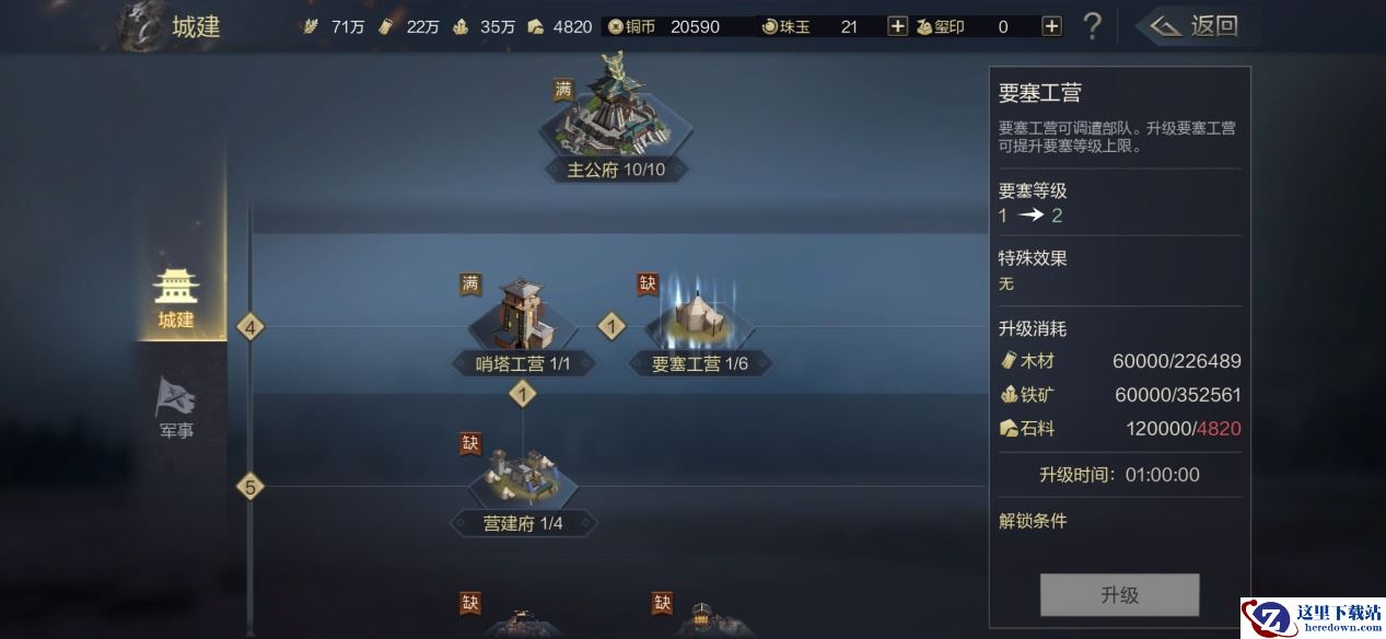 要塞城建是拥有要塞的第一部分,研究建造科技的“要塞工营”增加要塞等级上限与“营建府”增加要塞数量上限,而玩家的要塞等级与数量也一般是跟着联盟的要求走,具体要几级,都有告知,有能力的情况下自然是越高越好。要塞的核心功能体现在增加可占领面积的同时,也能提供为、兵力,以及最重要的补给。