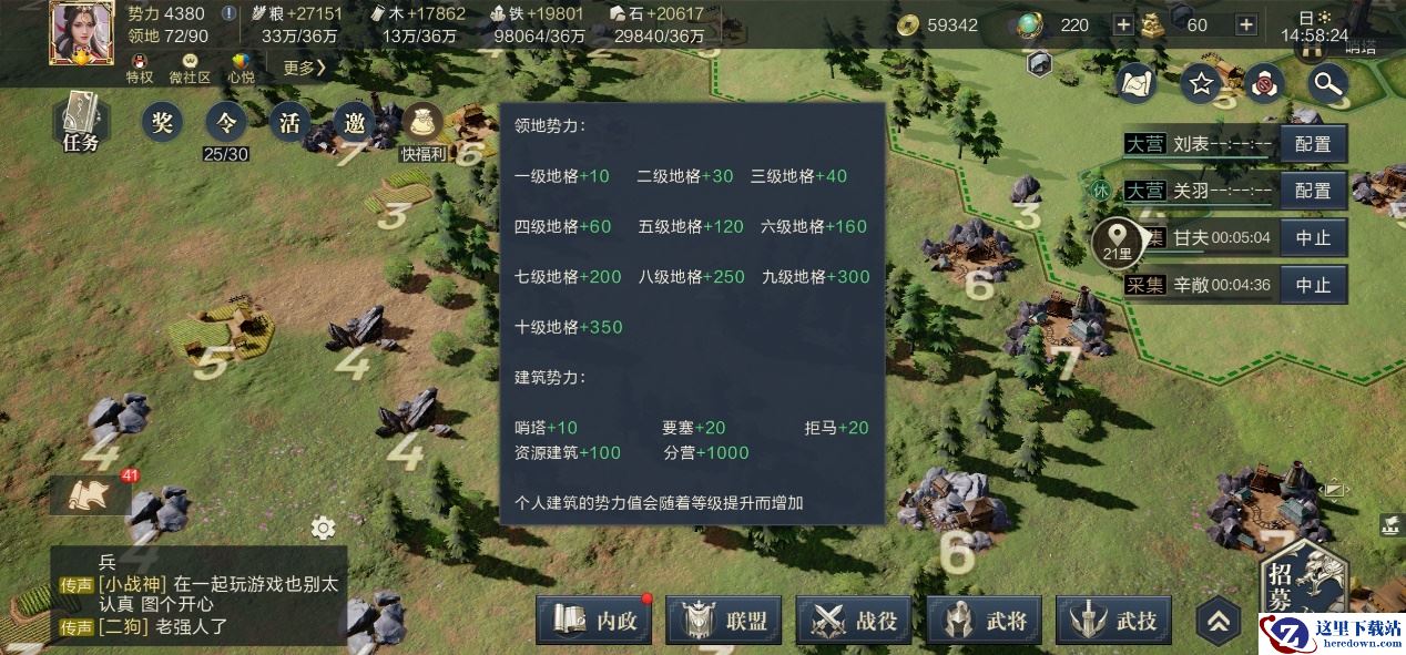 占领范围是一个特别的概念,只要在占领范围内,我们就可以自由占地,攻打资源地不需要卡点,也没有等待时间,我们的占领范围可以在右上角的三角形图标查看,初期范围是以主城为中心的六边形,不过军团在每次攻打占地后需要休整时间,也算是变相等待了,但问题不大。