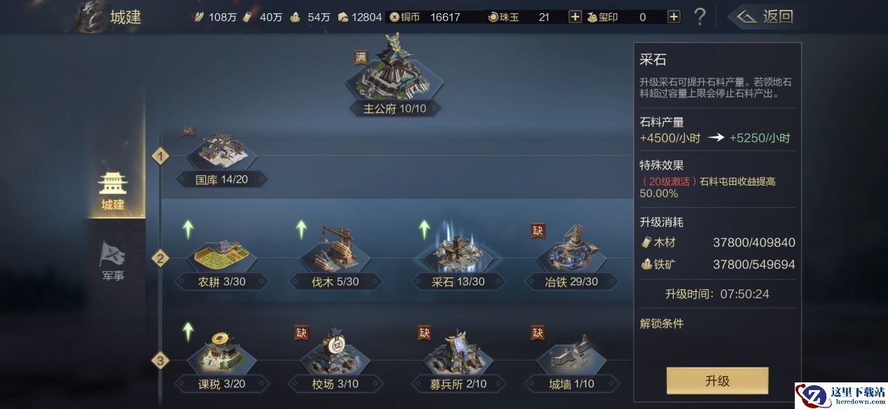 首先就是我们最常见的城建资源,在主线任务中前期就会让我们开始点的科技,五种资源全部囊括,有粮草、木材、石料、铁矿与铜币,而这里有个新手的误区,那就是不少玩家以为这个资源加成是算在资源地上的,每一个资源地获得额外这个产量的加成,但事实并非如此,实际上这个城建产量是独立计算的,可以理解为城建点出的科技就是一块资源地,只是我们消耗材料来增加这一块资源地的产量而已。