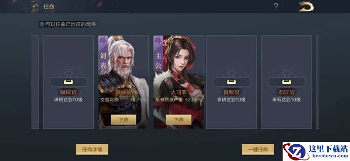 当我们的资源科技点到10级后,可以任命武将获得属性收益加成,建议预留一些魅力与政治属性较高的武将专门用来任命,前期破百属性就够用了,后期可以专门培养该属性的武将。