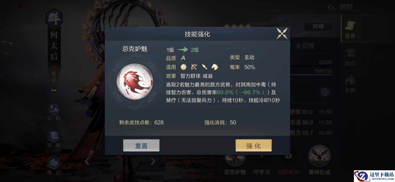 不过相信看下来的小伙伴也可以发现,何太后强势就在于其技能,而前期作为开荒武将,何太后还是有点无力的,其拆解下来忌克妒魅是魏国智力队非常关键的素材,但前期也可以让其与其他法师队伍组成法系二队,中毒还有一个小优势,那就是输出稳定,在缺少输出的情况下,何太后可以作为二队的替补。
