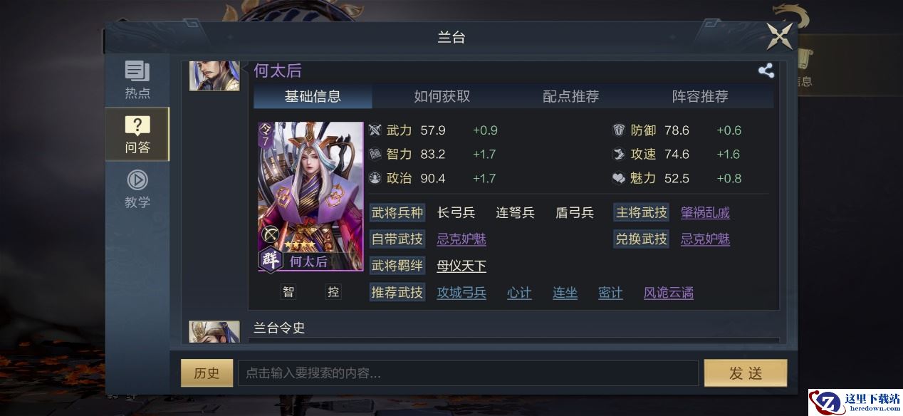但不用过于投入资源,中期如果有类似贾诩、郭嘉这样的毒将,可以作为优秀的输出插件,而后期的时候何太后的属性短板就会出现,这个时候拆掉将技能给其他毒将即刻。