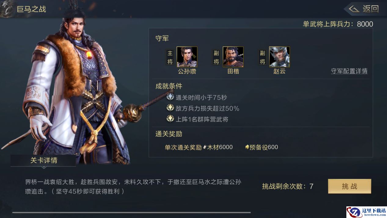 1.通关时间少于75秒;2.敌方兵力损失超过50%;3. 上阵1名群阵营武将