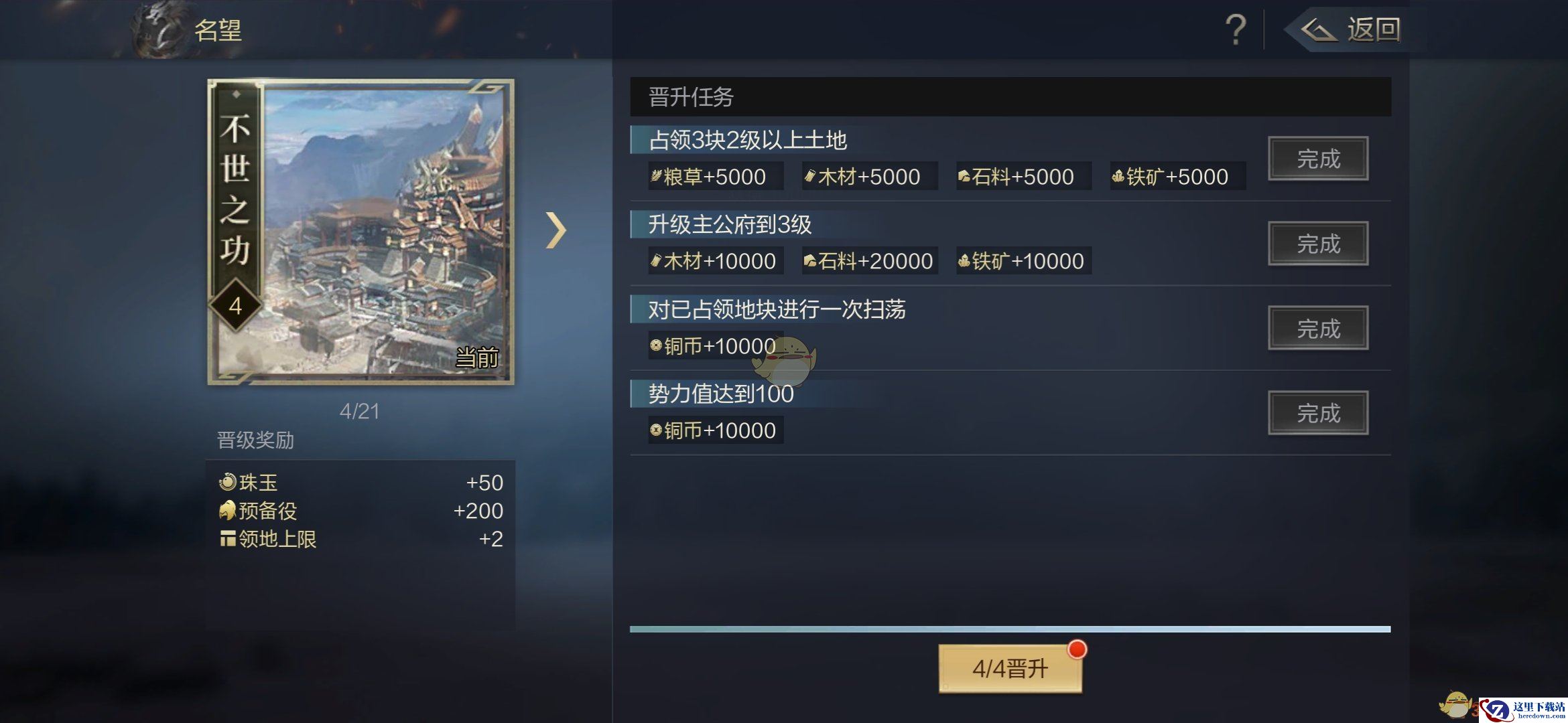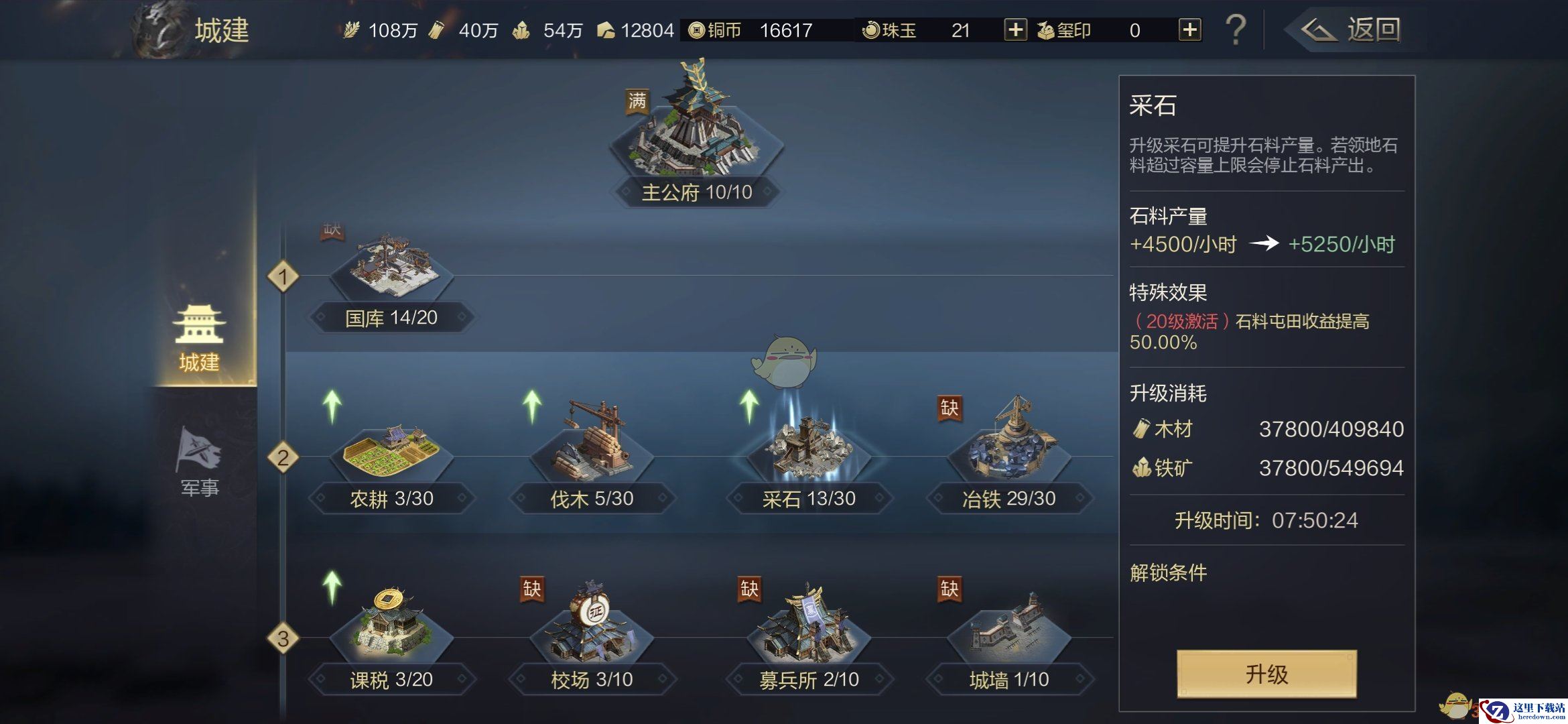 2、前期就做名望任务,跟着任务走即可,除了做任务的要求,伐木、采石、冶铁、课税的优先度都比农耕高,这三类资源是我们升级城建科技的主要资源,消耗更为迅速。反而粮草是征兵时消耗大,种田玩家可暂时不急。