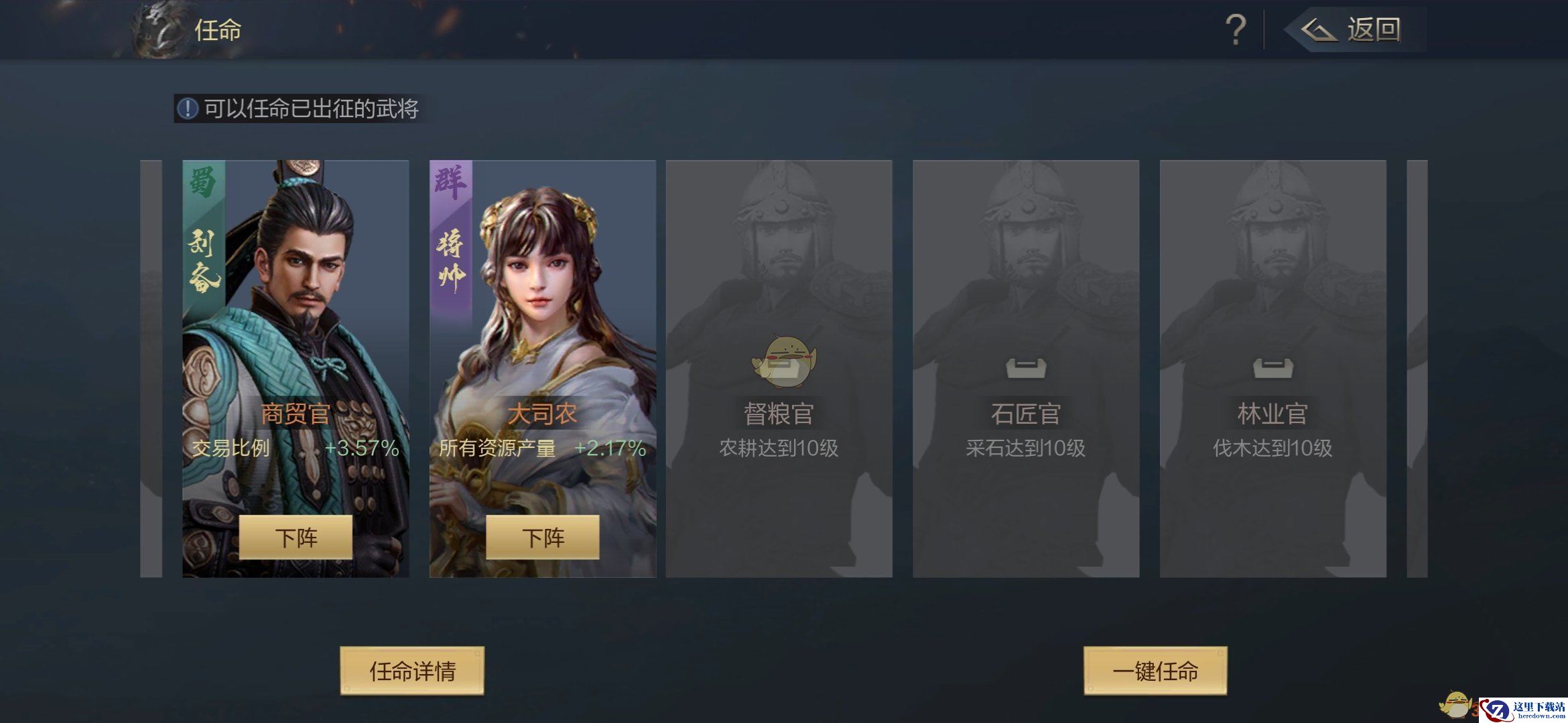 6、以上五种资源城建点到10级,可在内政中任命政治官员,根据政治属性,提高对应各种资源的产量与屯田收益。