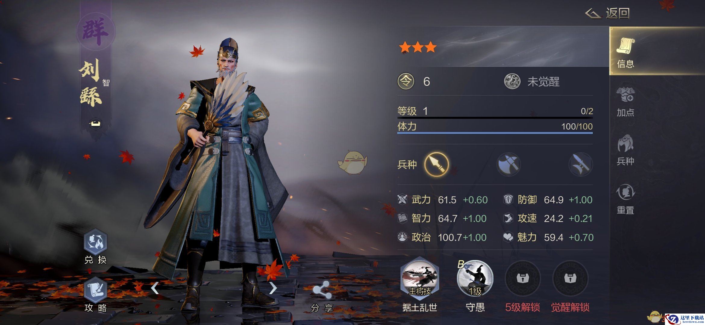 8、建议前期用满红的蓝将,三星满红能获得额外30点属性,入手轻松且性价比高,推荐刘繇、阚泽、王烈,这些都是政治属性高的武将。