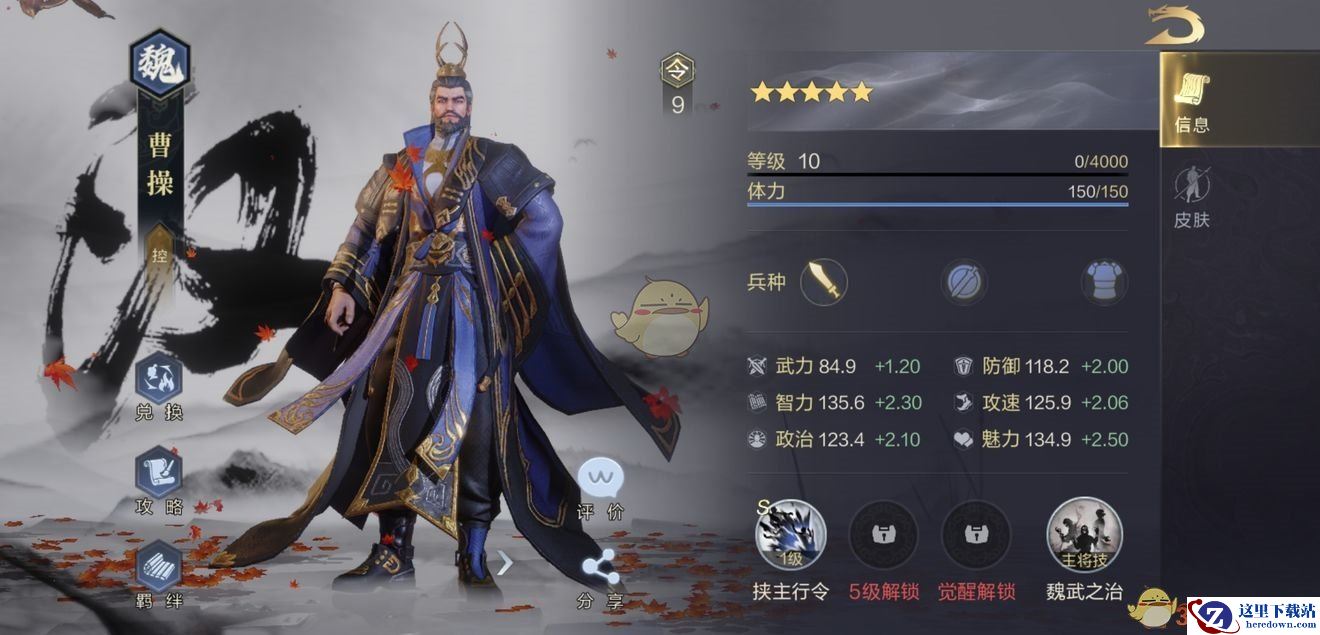 在最新的测试中曹操的技能被重做,在经历重做后曹操终于可以坐稳他三皇宝座了,每10秒的缴械或沉默的强控,加曹操的高额的政治成长,他的控制能力太强了。曹操只要带上他的羁绊队就立马成为T0强度,曹操的使用限制也比较低,他也可以随意搭配任何队伍。