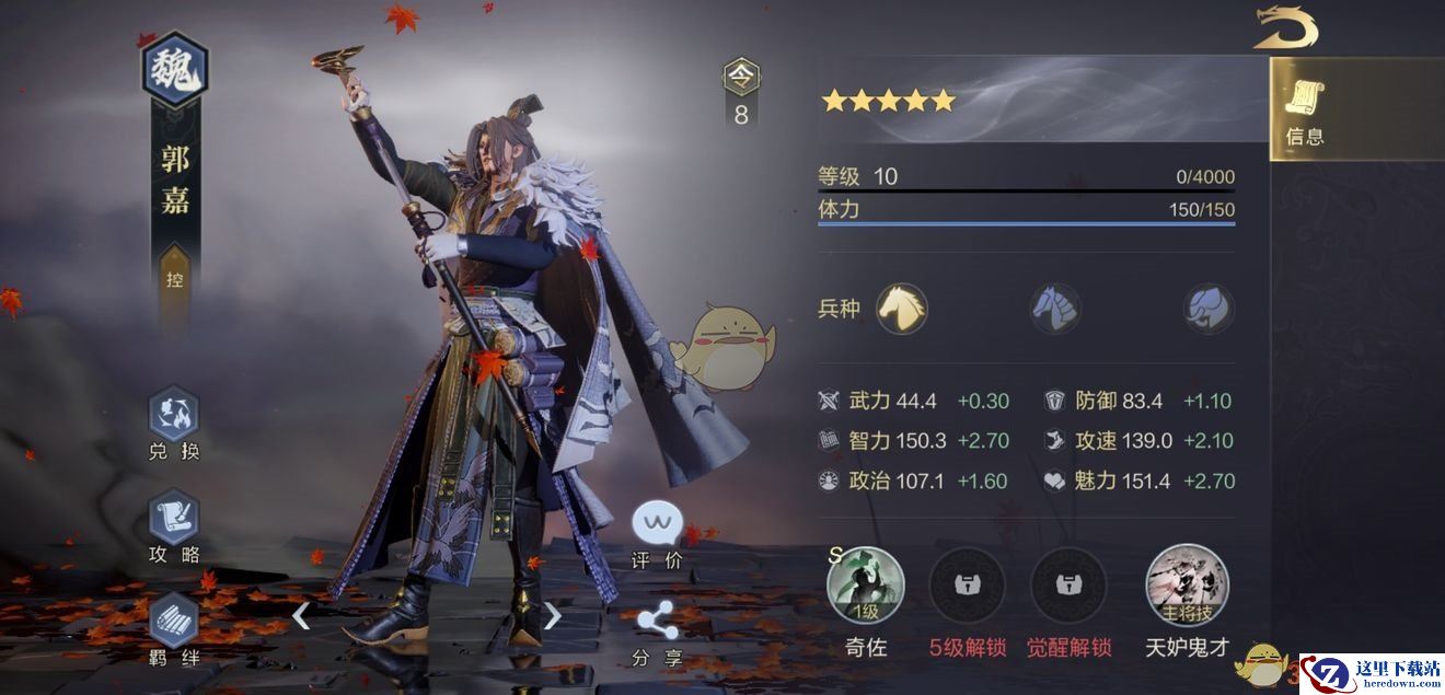 在目前的环境中郭嘉在某些方面的强度已经赶上曹操了,为他带上计略和忌克两个稳定毒Buff技能后高达70%的沉默控制效果让人望而生畏,而且10秒内可以触发两次,可以让对面两个将全程挨打。