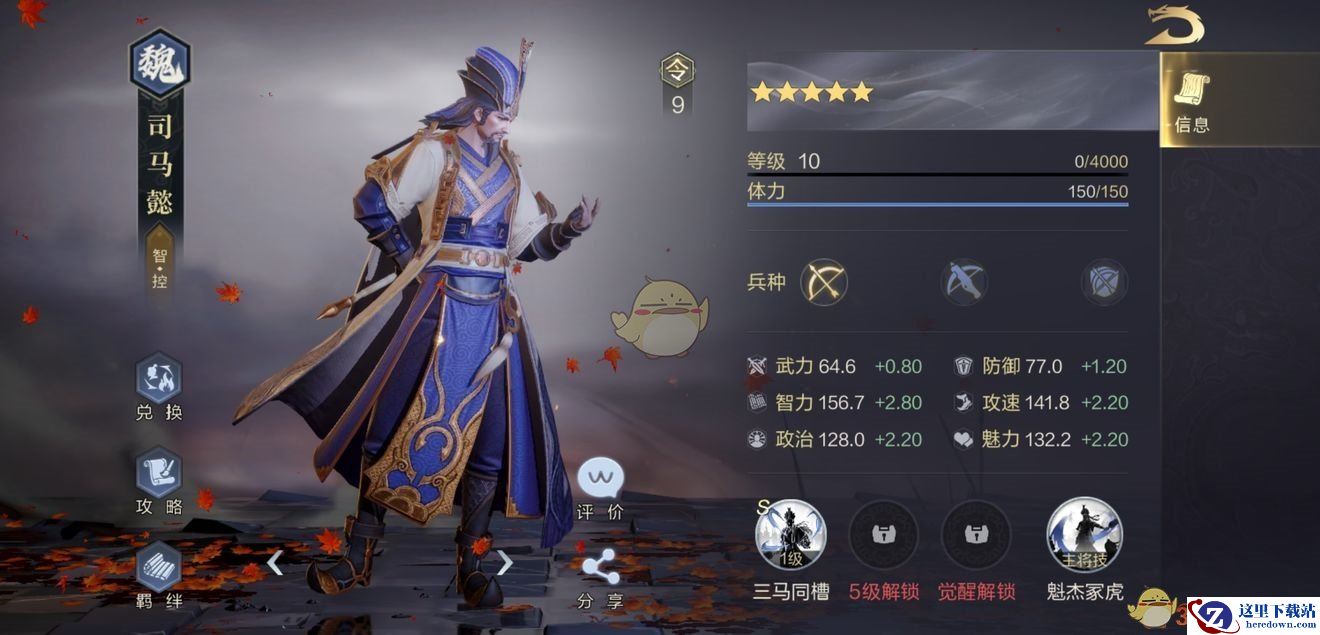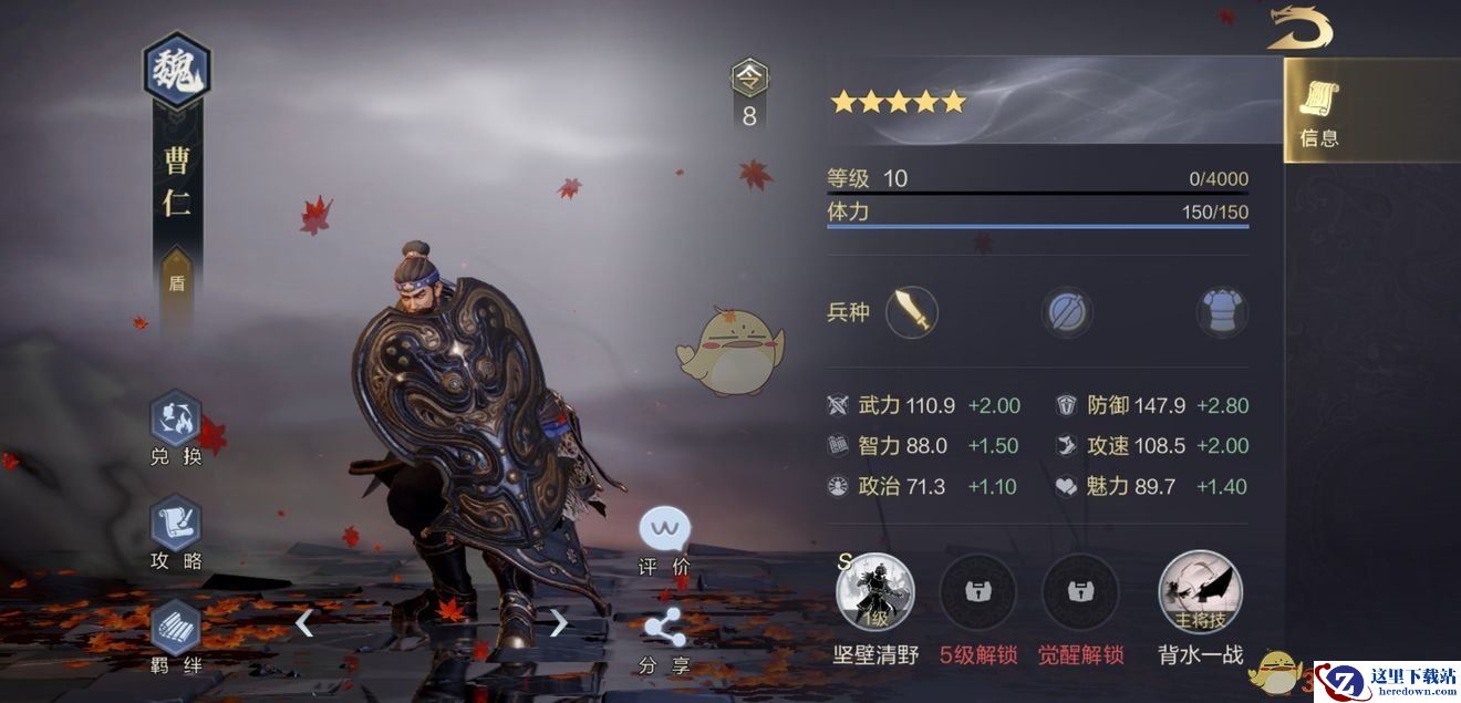 鸿图之下最肉的武将,本身可以提供60%的减伤而且还可以给全场队友增加30%的减伤。曹仁也是一个非常百搭的武将。