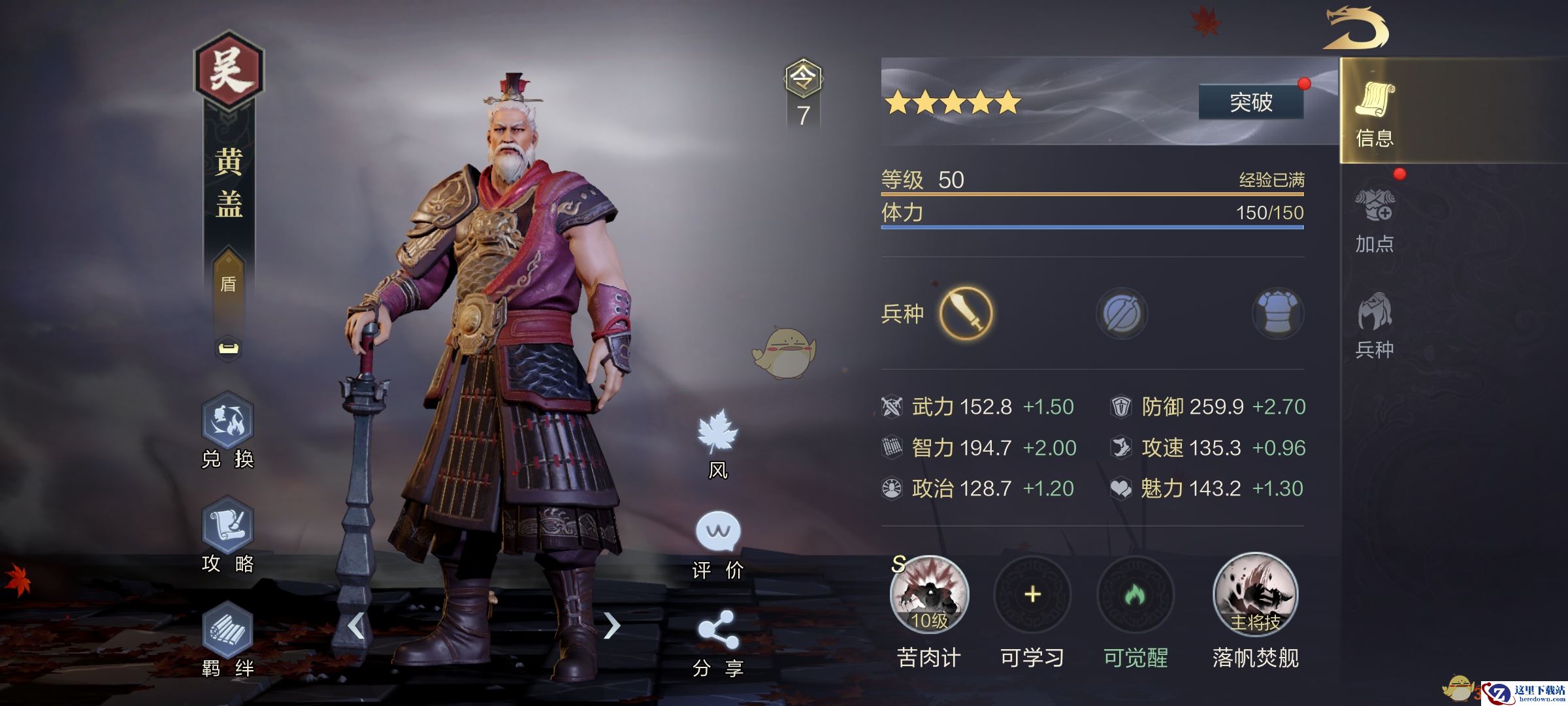 1、黄盖的定位是“盾”,属性中防御最高,满级259.8,智力其次,满级194.7,武力尚可,满级也有152.8,攻速属性就没有其他那么好看了,满级只有135.3。这样的属性,作为一个“盾”系武将,明显已经够看。尤其是259.9的极高防御,在“盾”系武将中,都可算是名列前茅。