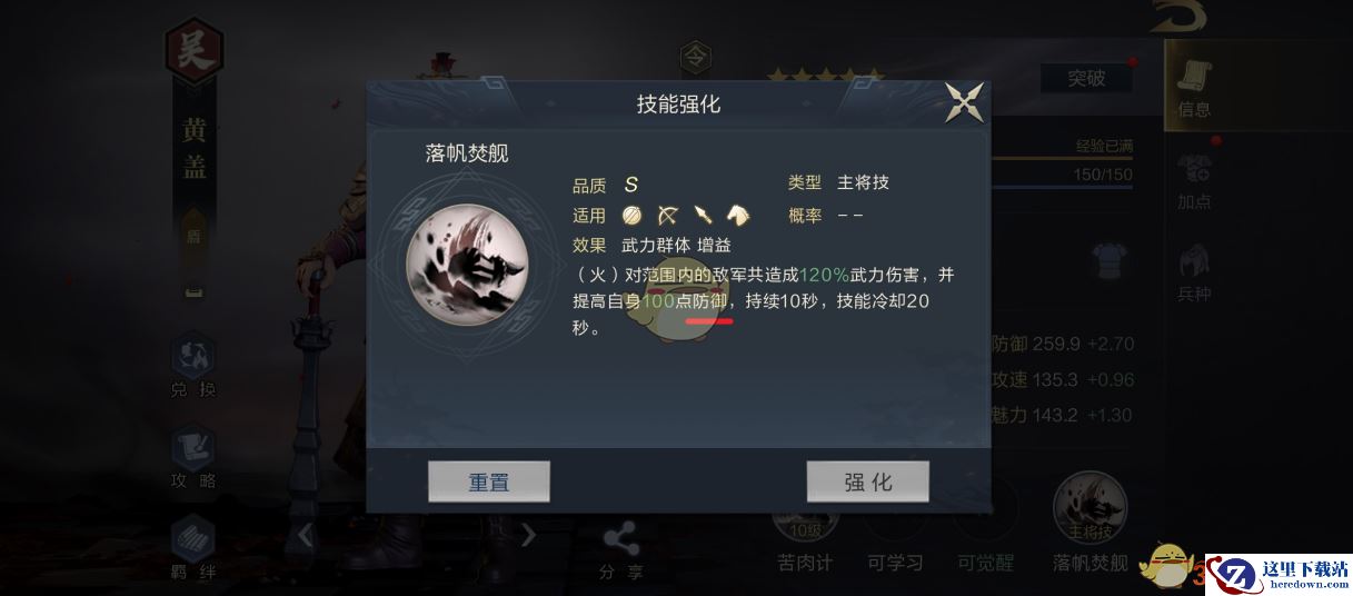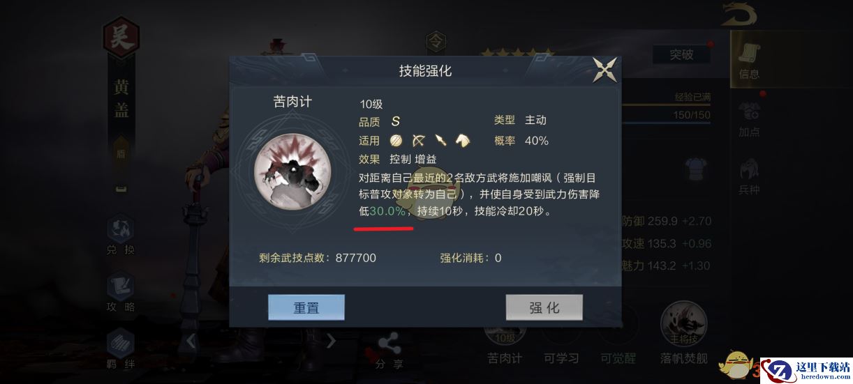3、黄盖的特色武技和可以兑换的技能,都是S级主动技“苦肉计”,发动时可以对距离自身最近的2名敌方武将施加嘲讽,强行使他们攻击黄盖。同时,也会使自身受到物理伤害降低30%,持续十秒。