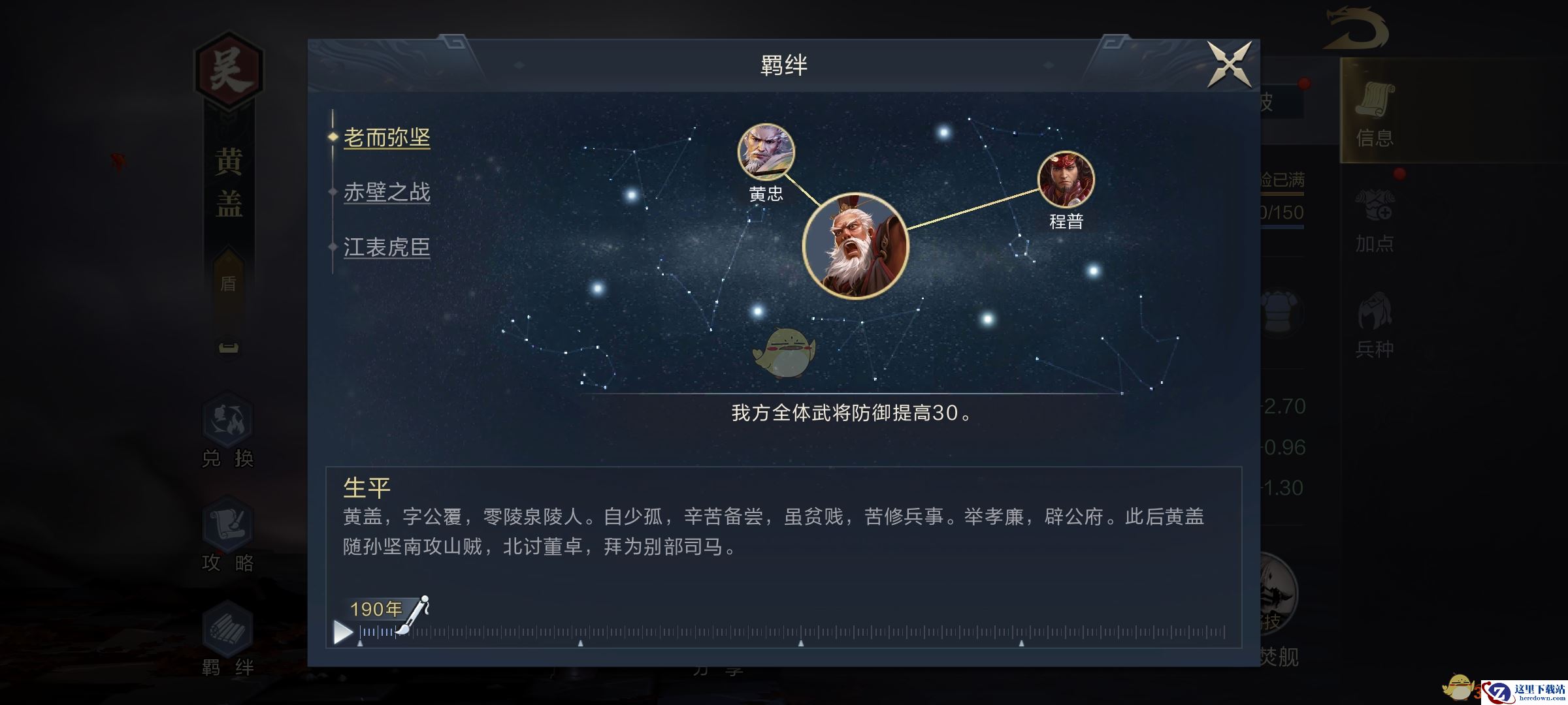 7、羁绊方面,黄盖拥有多种选择。他可以和黄忠、程普组成“老而弥坚”,提高我方全体武将30点防御。可以和甘宁、周瑜组成羁绊“赤壁之战”,使我方全体武将提高5%主动武技伤害。也可以和蒋钦、甘宁、丁奉、凌统、韩当、程普组成“江表虎臣”,提高我方全体武将10点武力,以及5%的暴击几率。