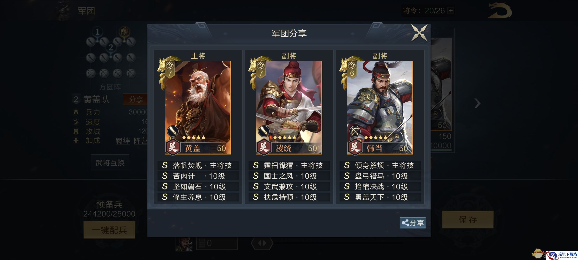 2、与此同时,副将凌统可以通过“国士之风”和“文武兼攻”输出武力、智力兼备的伤害,而副将韩当则可以通过自身技能“盘弓错马”克制敌方骑兵、弓兵类武将。同时,韩当在安全的前提下,携带上“抬棺死战”和“勇盖天下”输出大量伤害。