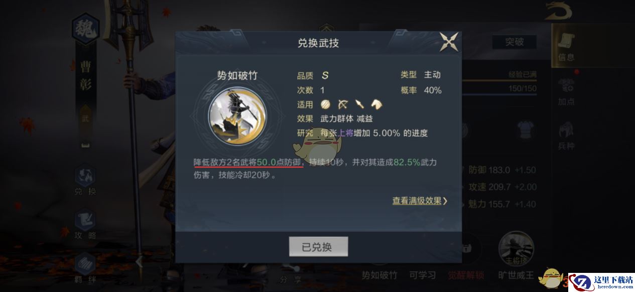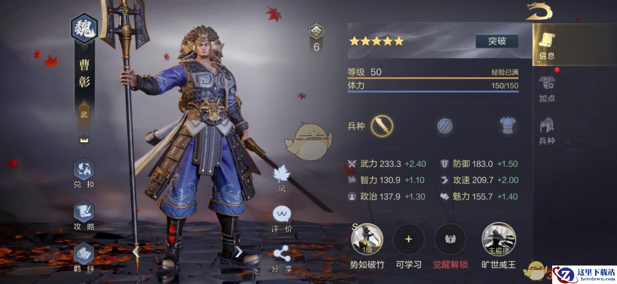 6、分解曹彰后,同样会获得主动技“势如破竹”。这就意味着能以曹彰为核心,搭配一支“减甲流”队伍,对于那些以高防御为特色的队伍,有一定的克制效果。