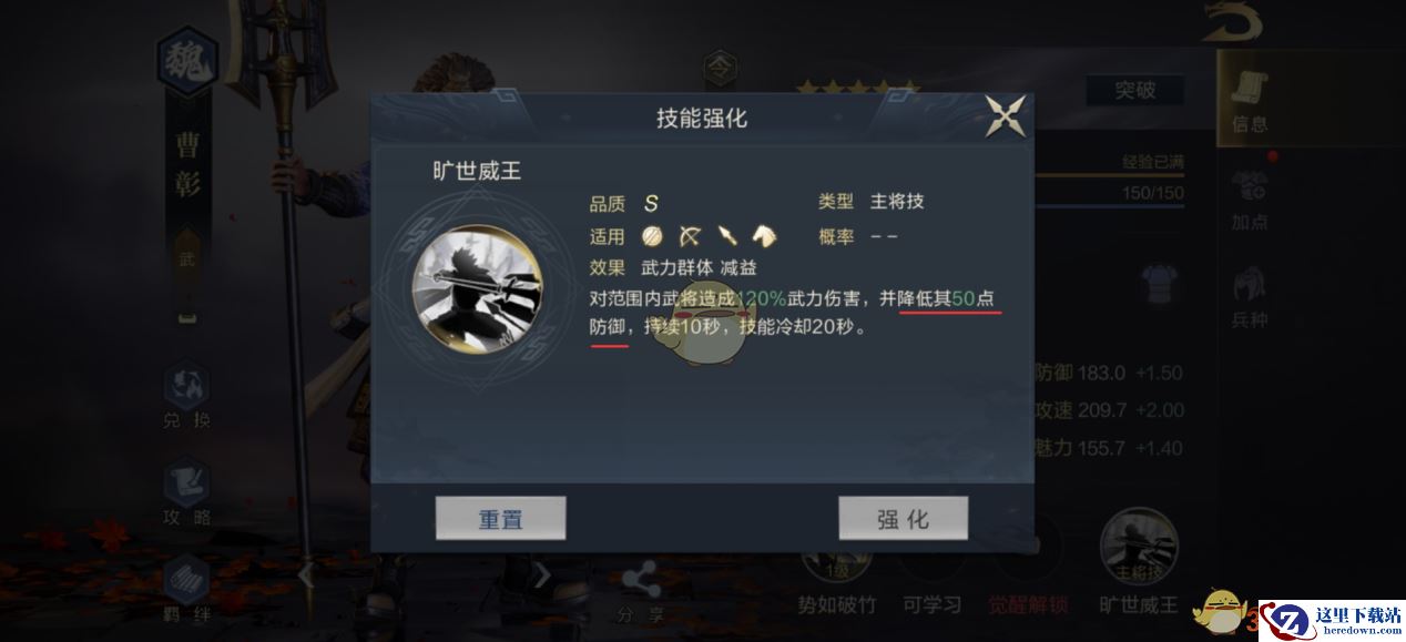 4、曹彰的主将技为“旷世威王”,适用于全兵种。效果为对范围内的敌军武将造成武力伤害,同时降低其50点防御。减防对于武力武将来说,是十分重要的增伤手段。这不仅意味着曹彰能对减防目标造成更多伤害,其他武力武将攻击减防目标时,也能造成更多的伤害,是相当不错的减益效果。