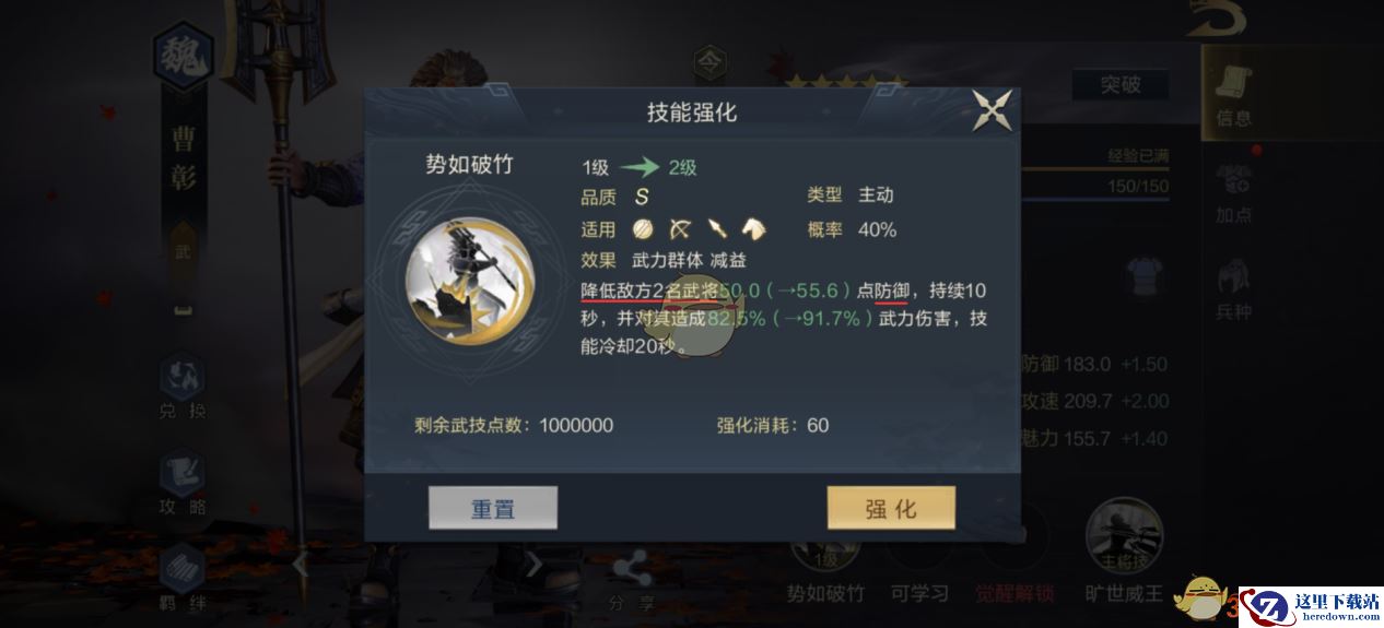 5、曹彰自带的专属技能为“势如破竹”,主动技。“势如破竹”能指定两名敌方武将,造成武力伤害的同时,削减敌方的防御,并且数值随着技能等级提升而增加。这使得曹彰成为一个无情的“减防机器”。配合主将技“旷世威王”,即便是盾系武将,在曹彰面前也会变成低防御的脆皮。
