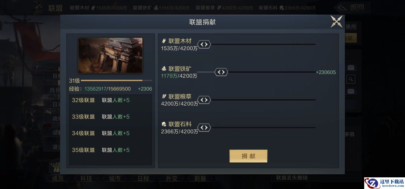 点开联盟首页,右上角联盟名称的下方能看到一个经验条和“捐献”,点击“捐献”可以把自己多余的资源全部捐给联盟。