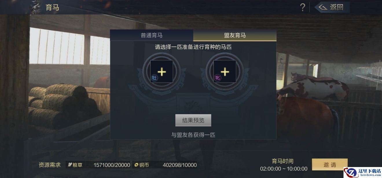 2、育马:玩家的名望达到18级之后,可以开启育马玩法,但是,如果你不加入联盟,那么你就只能自己准备两匹基础马不断配种,效率很低。而加入联盟后,你可以同联盟的玩家的马一起配种,如果运气好,还有几率培育出多属性的橙马,装备在武将身上能大大提高军队的实力。
