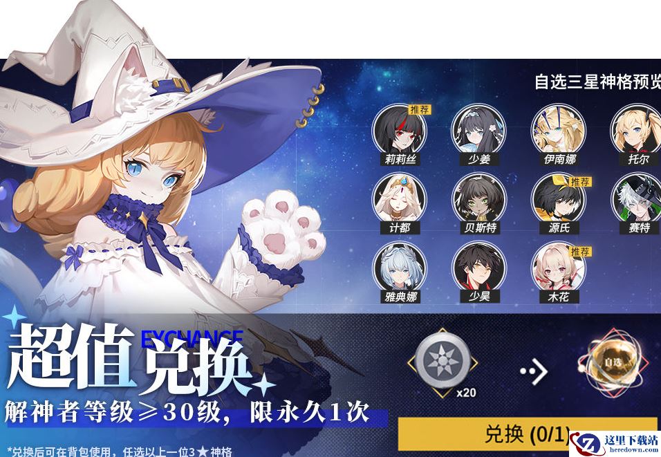 (自选3★神格可在以下3★神格神格中选择一个领取:雅典娜、莉莉丝、托尔、少姜、赛特、贝斯特、伊南娜、少昊、源氏、木花石长姬、计都)