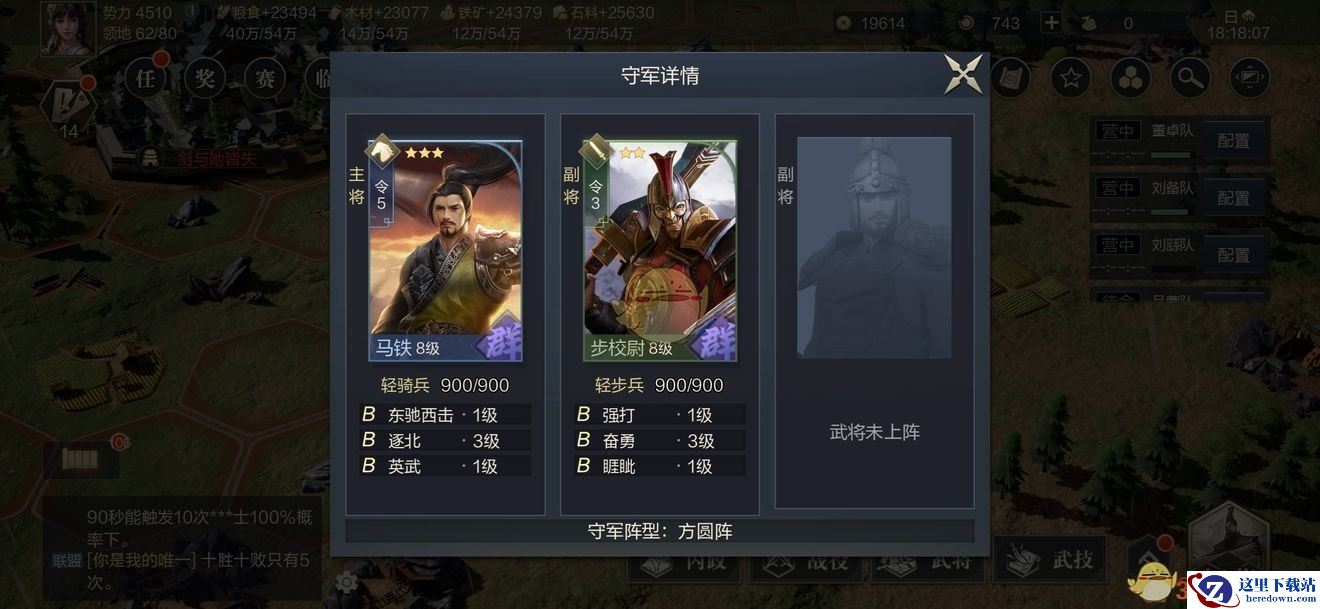 而想要攻略四级地,我们的阵容必须点出第二副将,只要能上3个武将,平均等级13、14级就可以打了。