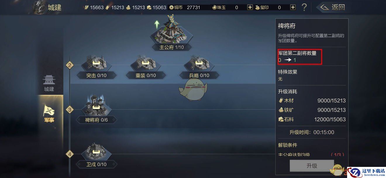 通过军事科技中的“裨将府”可点出军团的第二副将,其他军事科技的进度不能拉下,属性提升很关键,其中“太尉府”可以解锁额外的军团,至少点出第二军团,给后面开荒六级做准备。