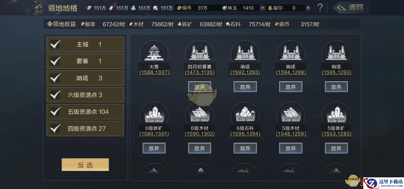 领地是用来统计目前为止你所占领的资源的数量,位置以及资源等级的,并且大家可以直接通过领地界面放弃低等级资源,跳转到某个指定哨塔,要塞等等。