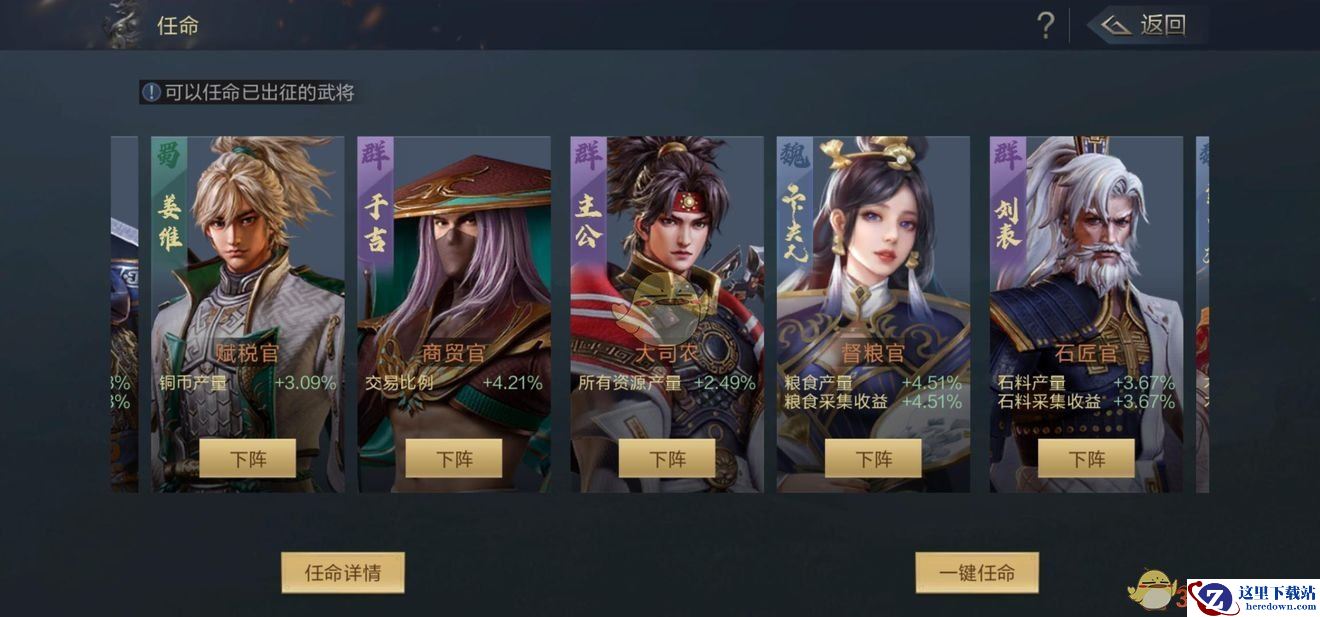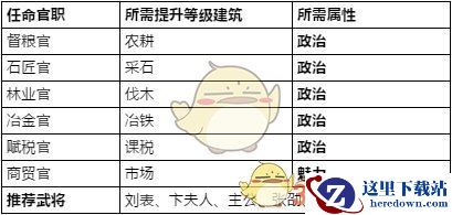 玩家通过任命武将来提高各种资源的产量。目前可任命的职位是大司农、督粮关、石匠官,赋税官以及商贸官。其中除了商贸官看的是武将的魅力值之外,剩下的都看的是政治点。另外,粮食,石料,铁矿以及林业这些官员的任命需要城内相应建筑达到10级。