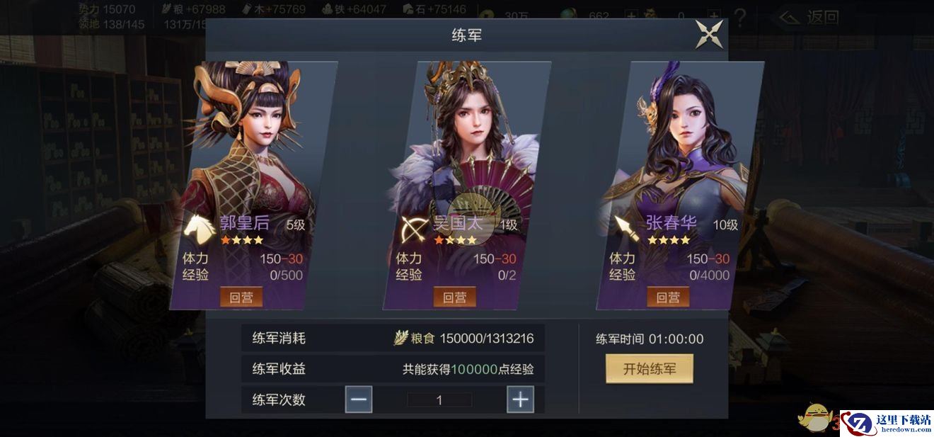 注意:已经在队伍中的武将需要遣散自己所有带的兵才能练军,如果你想要练军的武将正好在队伍中并且配置了士兵,可以先跟随队伍去野外通过“练兵”,消耗一些士兵之后再“卸甲”武将去练军,遣散士兵会返还80%的资源。