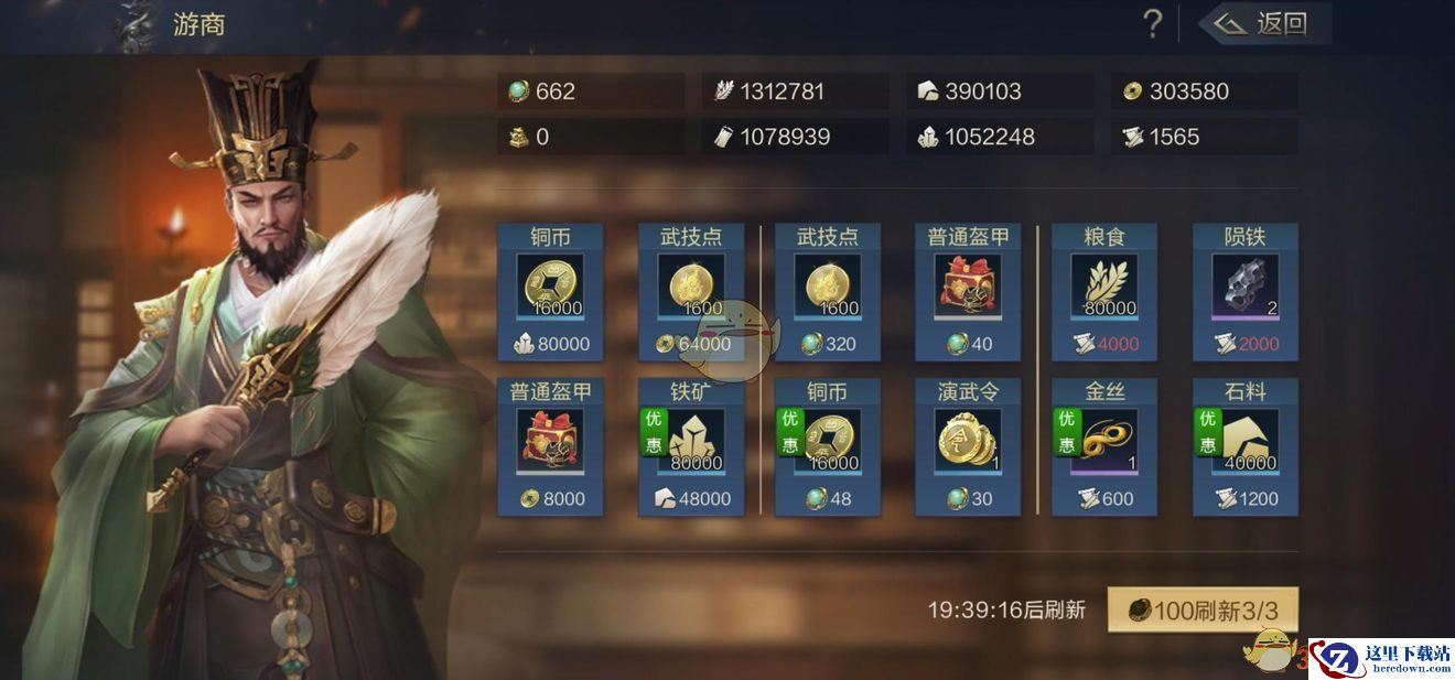 游商内的商品每24小时自然刷新一次,目前游商有三种兑换方法,第一种是资源(包含铜币)兑换资源,第二种是珠玉兑换资源,第三种是战功兑换。