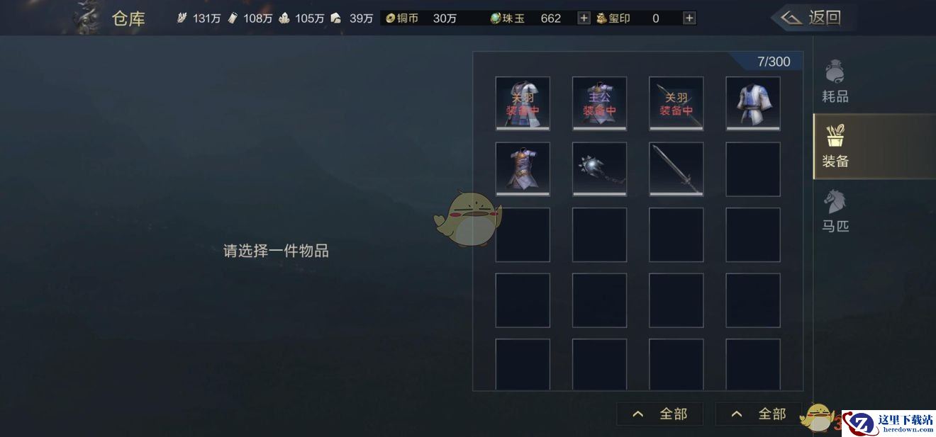 仓库主要用于装各种道具,比如说演练收到的图纸,获得的马匹,武器,装备都可以在仓库中看到。如果你在地图上获得任何道具找不到了,建议先看看仓库。