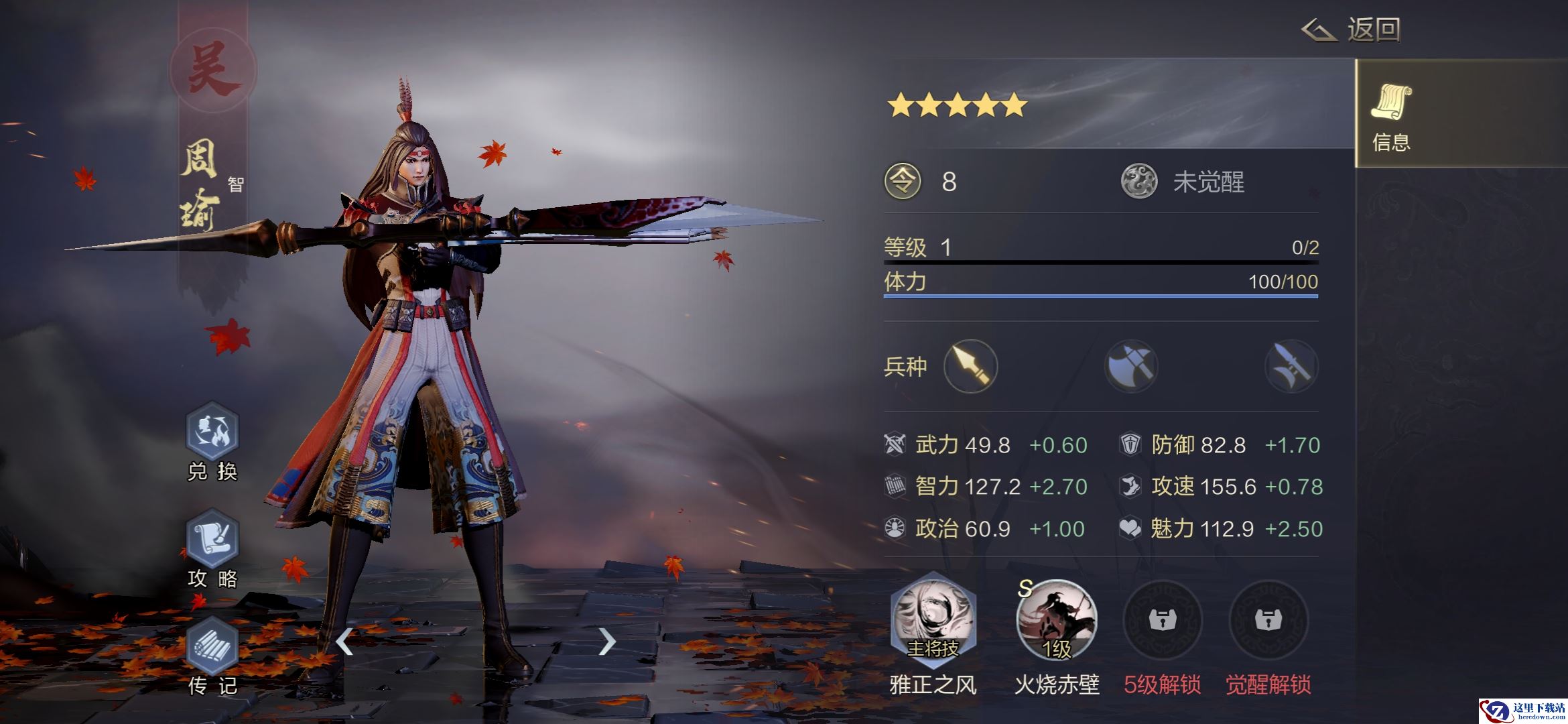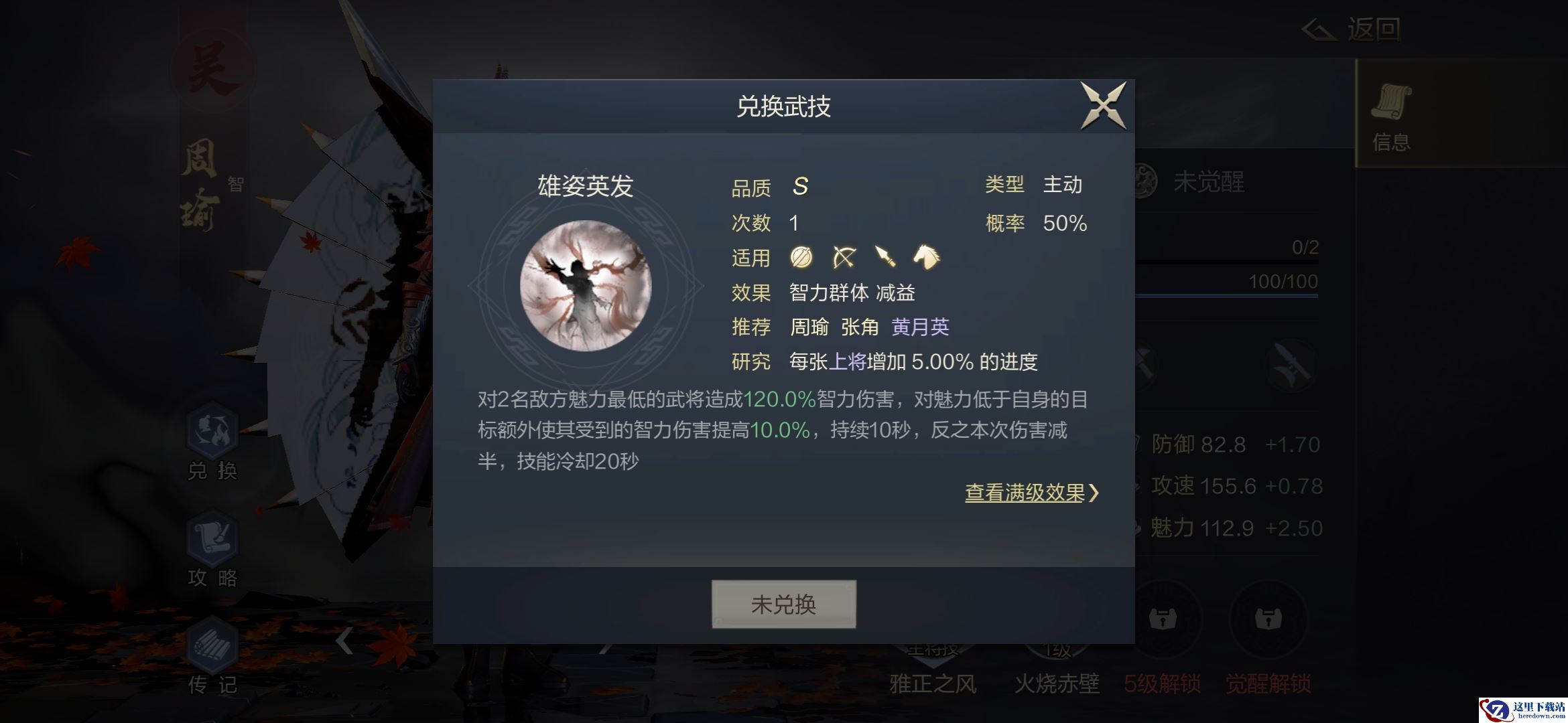 周瑜,最擅长打丑男,吴国法师队的代表,兑换武技可以使对于魅力比自己低的角色收到更多伤害,本身的主带武技和主将技也是可以附加额外效果的武技,非常不错。