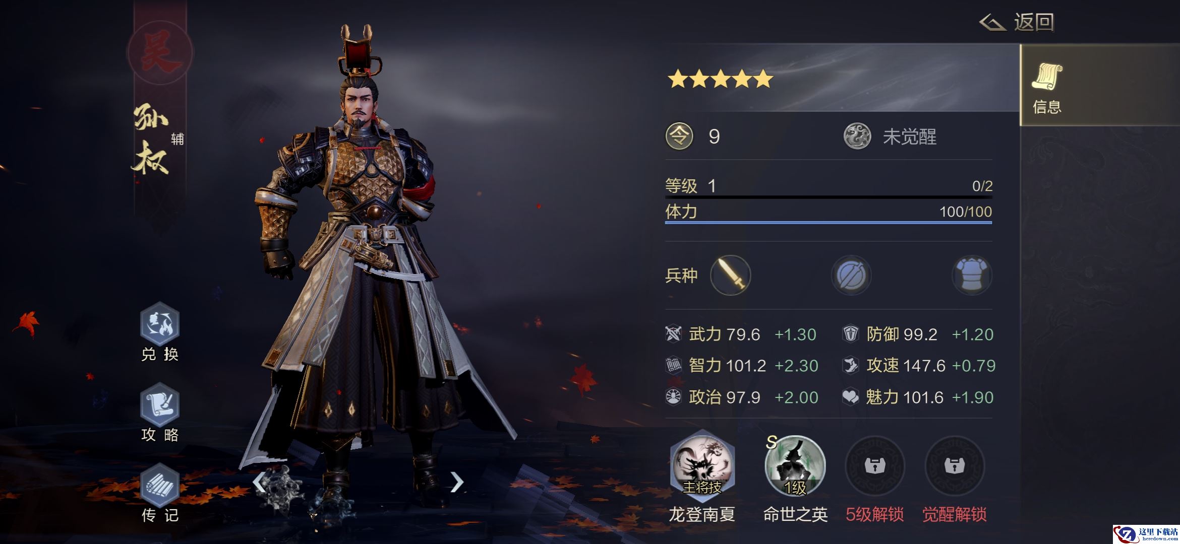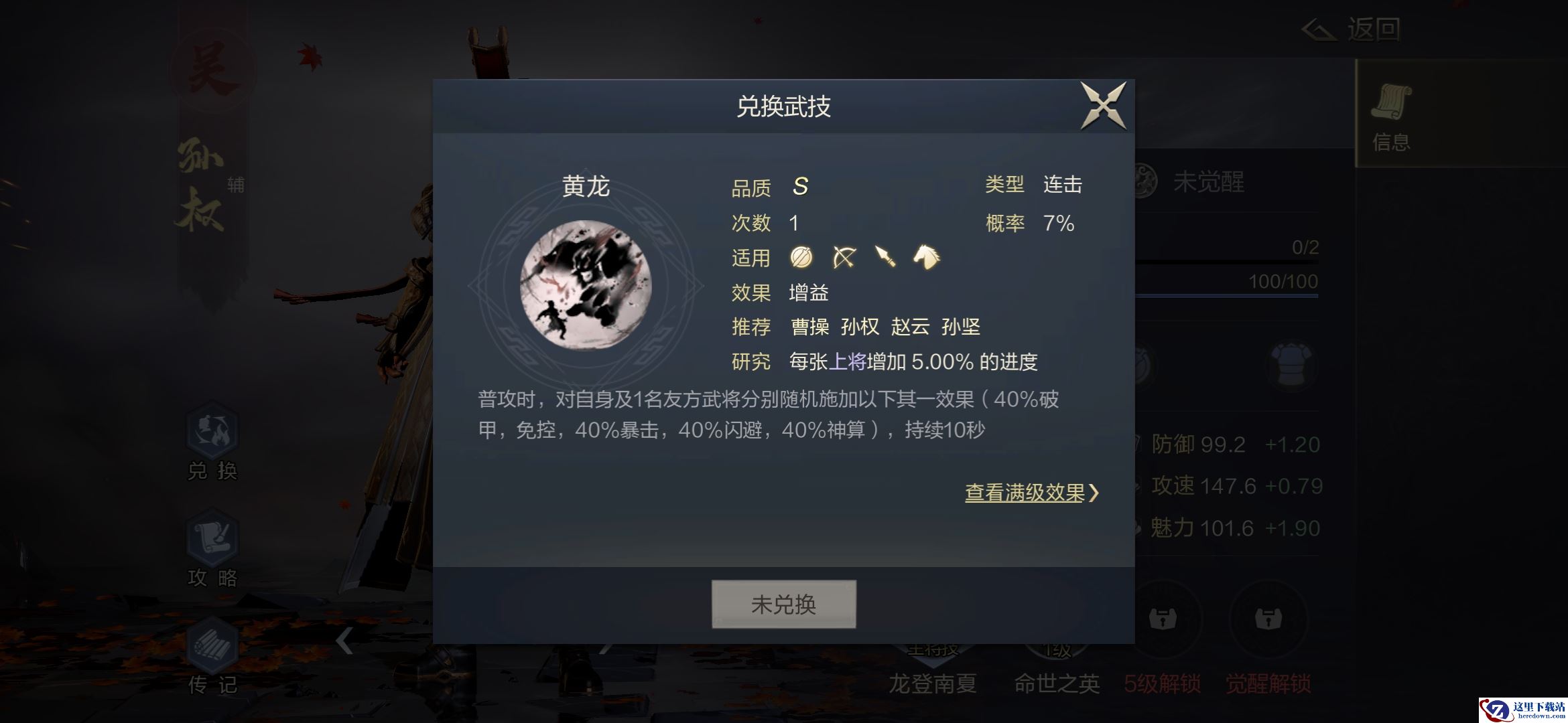孙权虽然强度很不错,但有点难用的角色,主要是搭配少,目前正面buff叠加的问题,目前三孙和三皇中感觉孙权主要还是辅助的感觉,不过其兑换武技是连击的毕业武技哦。