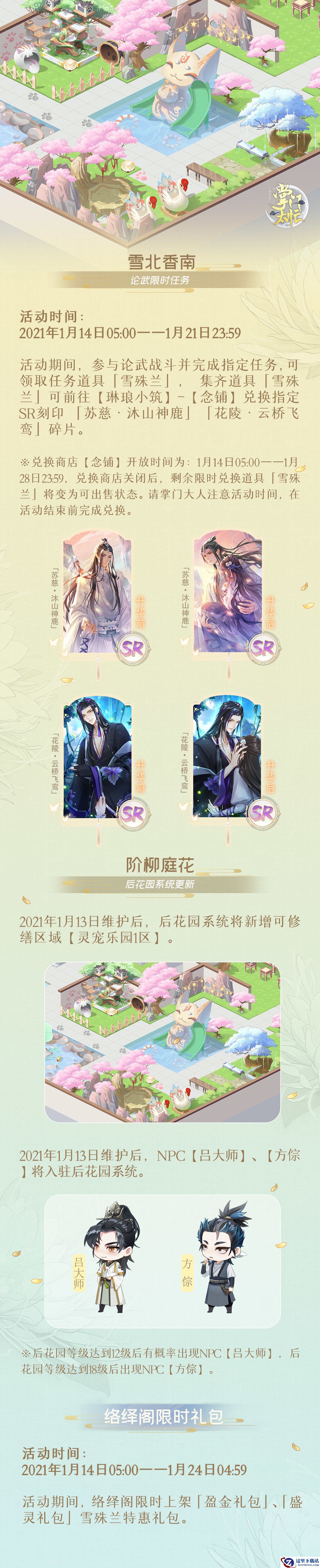*兑换商店【念铺】开放时间为:1月14日05:00——1月28日23:59,兑换商店关闭后,剩余限时兑换道具「雪殊兰」将变为可出售状态。请掌门大人注意活动时间,在活动结束前完成兑换。