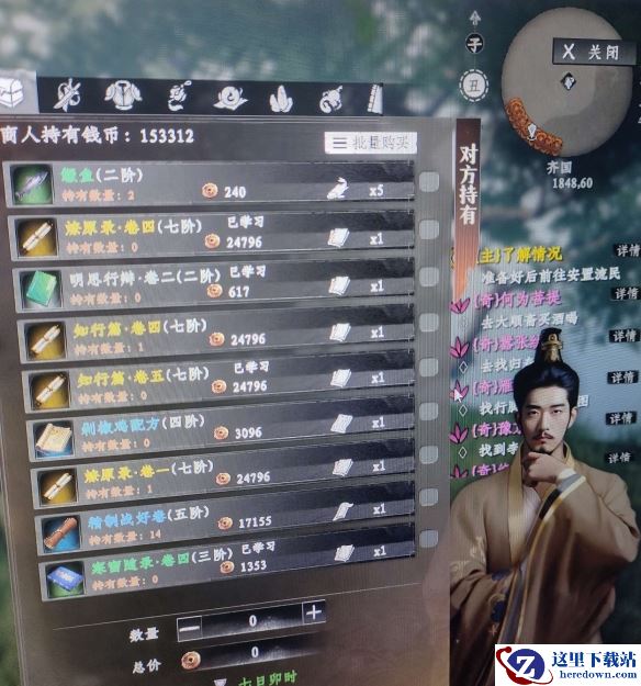 (1848,60)处的游吟出售菩义和书戒七阶书,还有一些炼丹所需的材料。