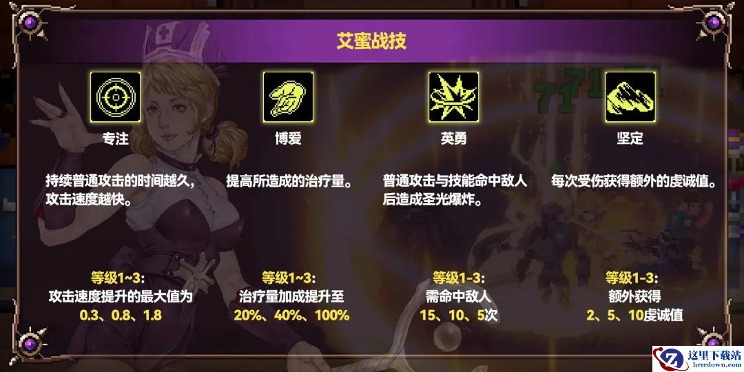 艾蜜的四个战技为:专注、博爱、英勇、坚定。