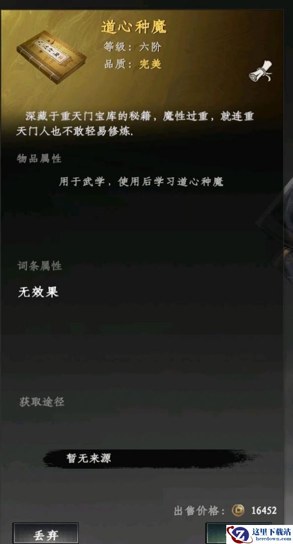 5. 夺权后会直接成为掌门,获得一本金色秘籍道心种魔,道心种魔属性见下图。