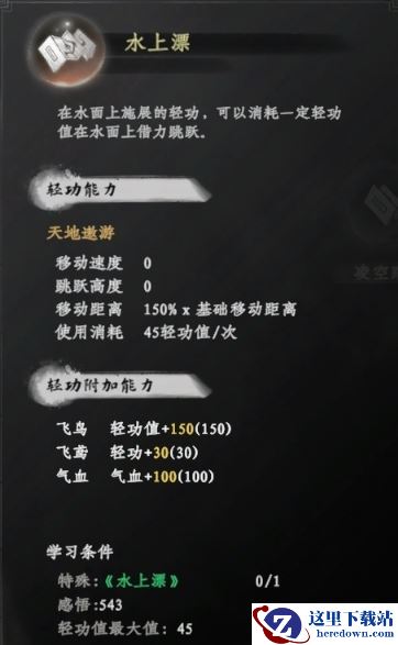 3、学习条件:水上漂秘籍*1,感悟543,轻功值最大值45