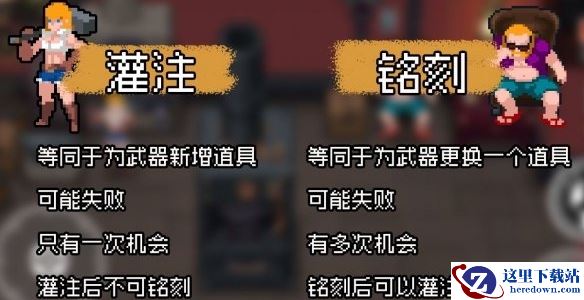 武器品质从低到高分为白色,绿色,蓝色、橙色、红色。品质越低,基础属性提升越小,附带的道具也越少。武器掉落在蓝色宝箱。要是不想要,也能换了卖钱买更多道具。即使是道具懒人包,也是可以高度客制化的呢!游戏内两个武器升级的方式是铭刻与灌注。